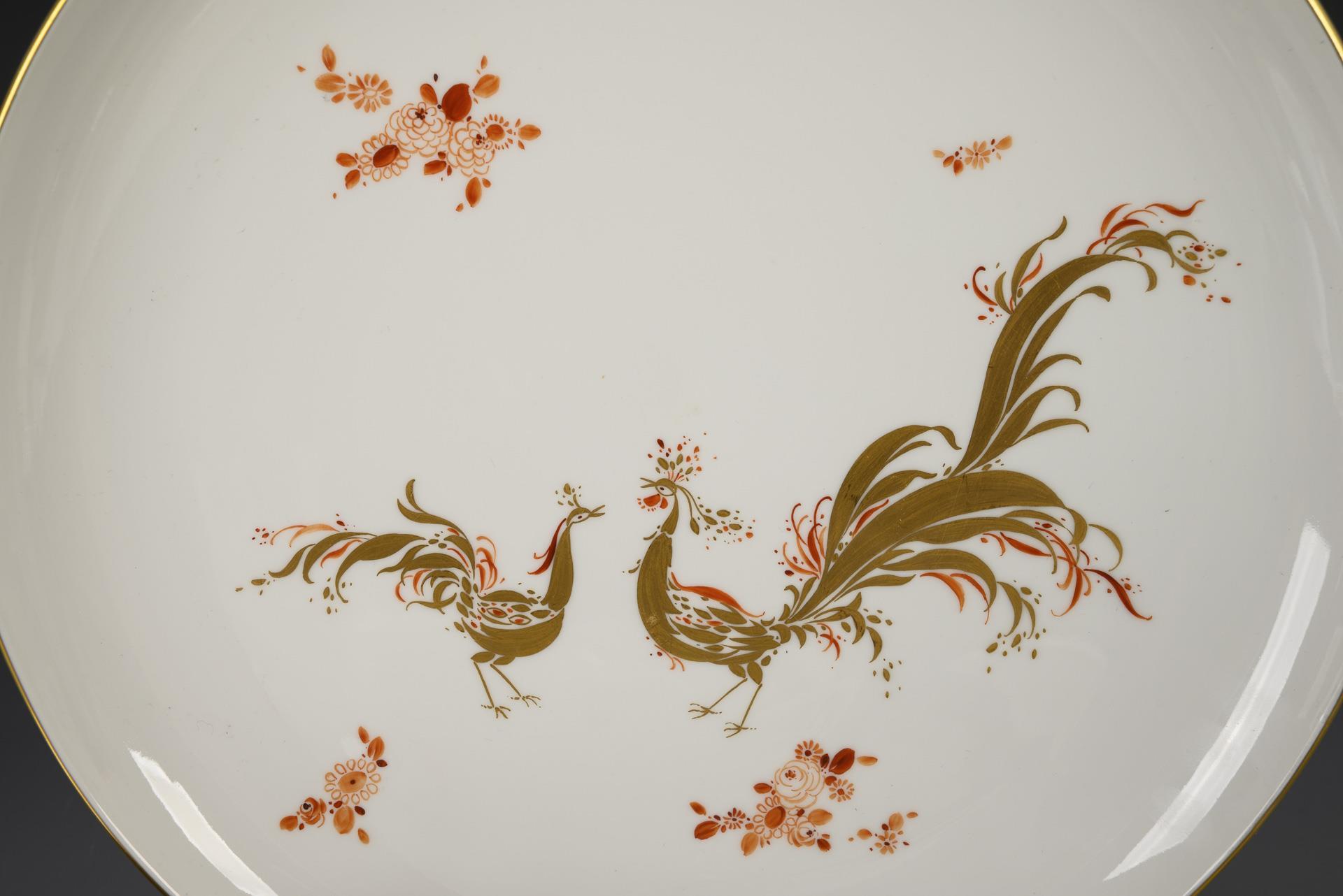 Bird of paradise painted in red and gold, surrounded by red scattered flowers. H max. 27 cm.