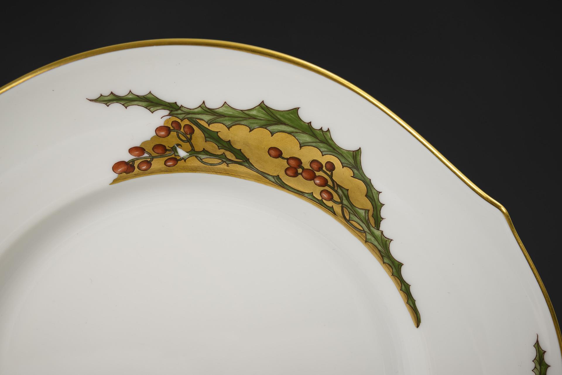 Polychrome painted holly leaves and fruit in front of gold fond cartouches. H max. 16 cm.