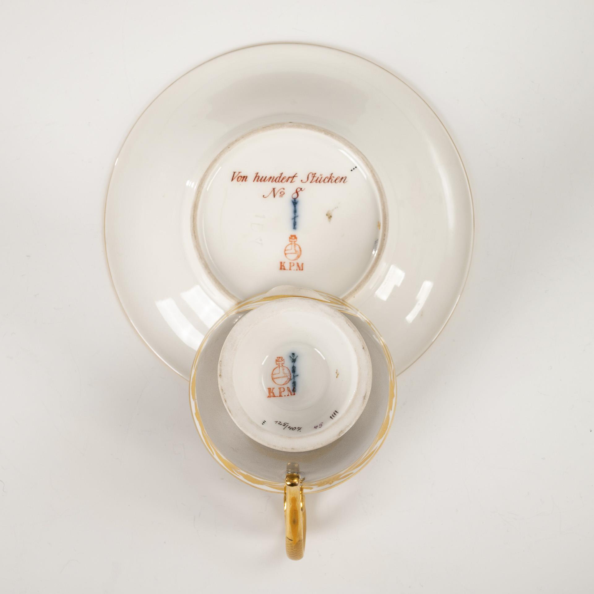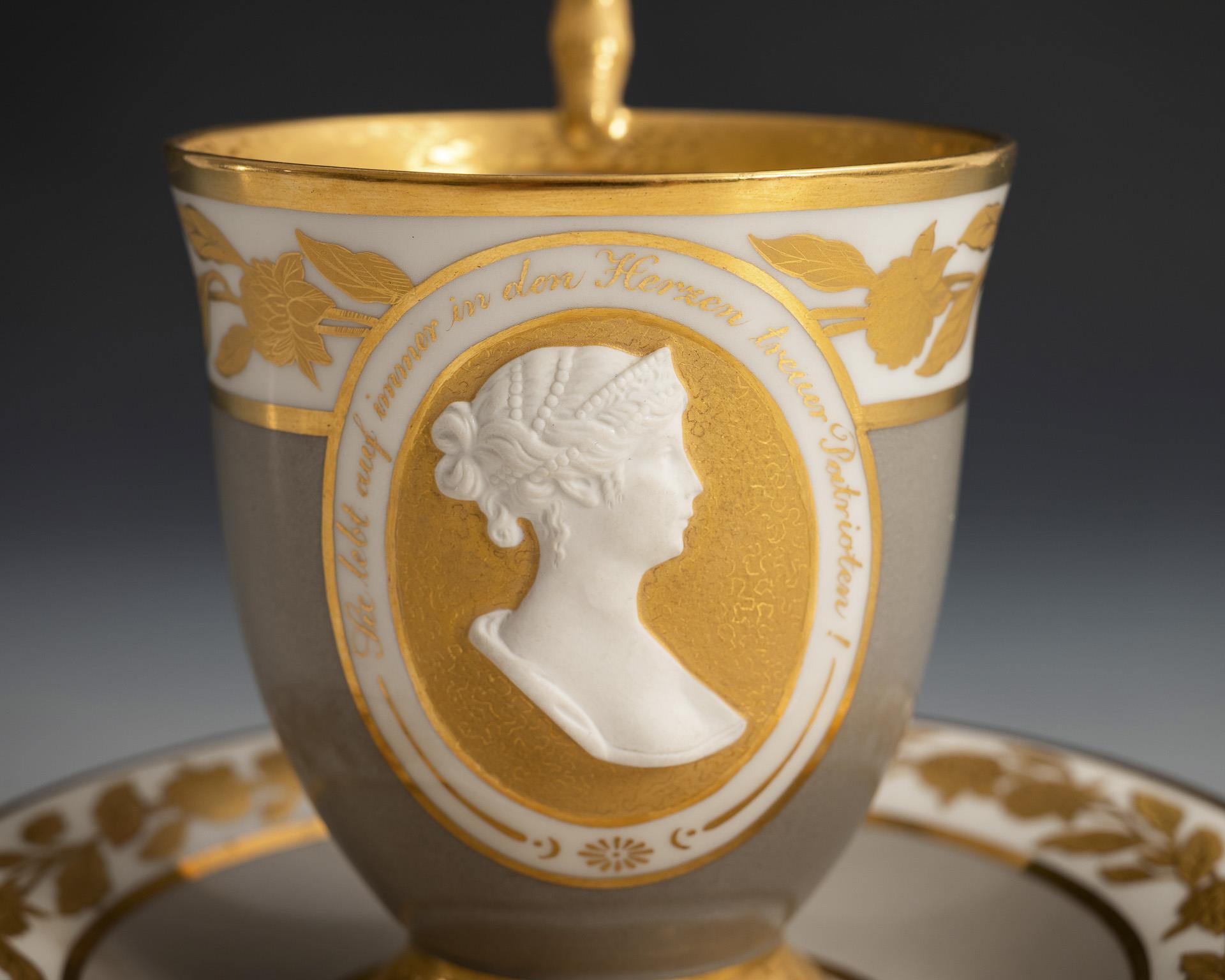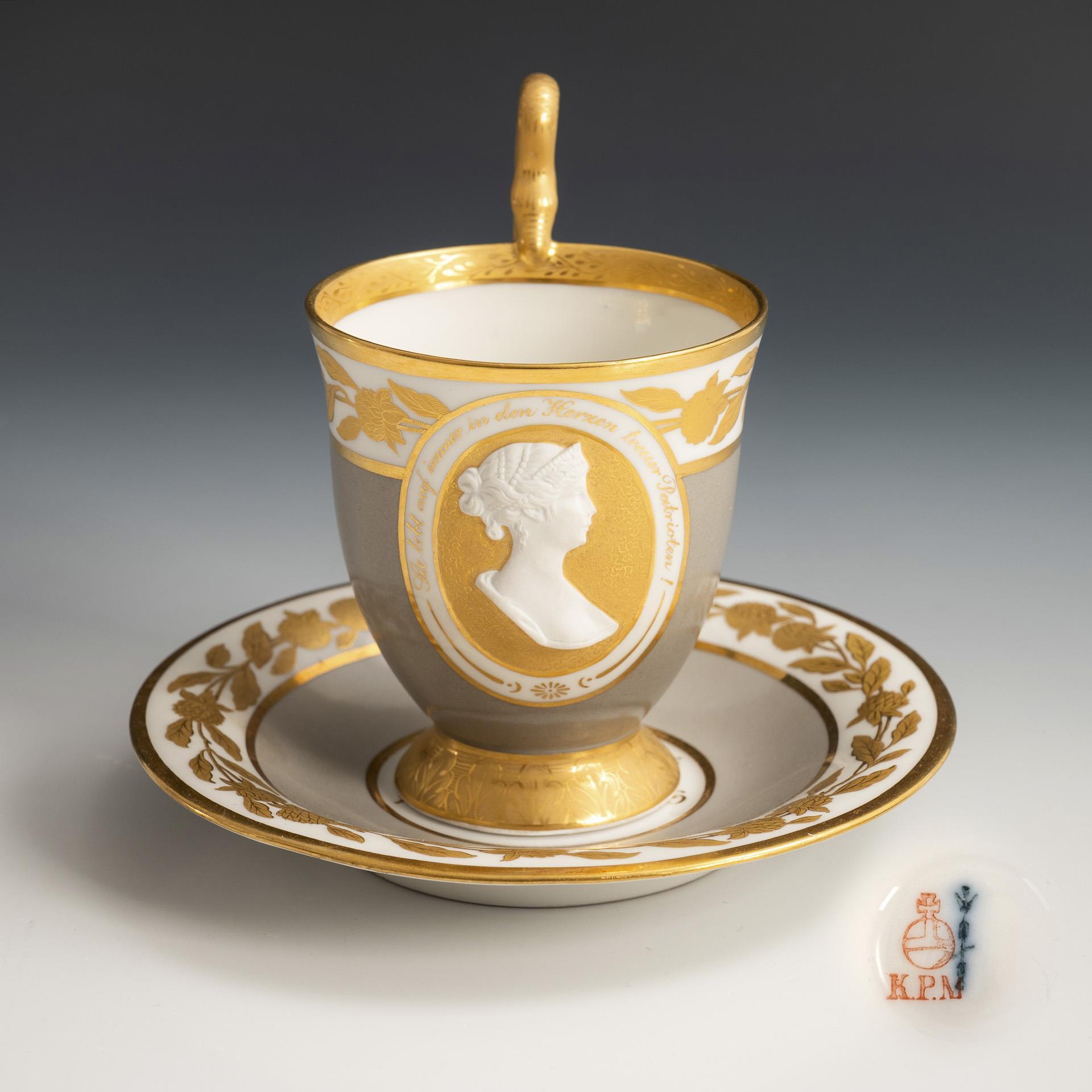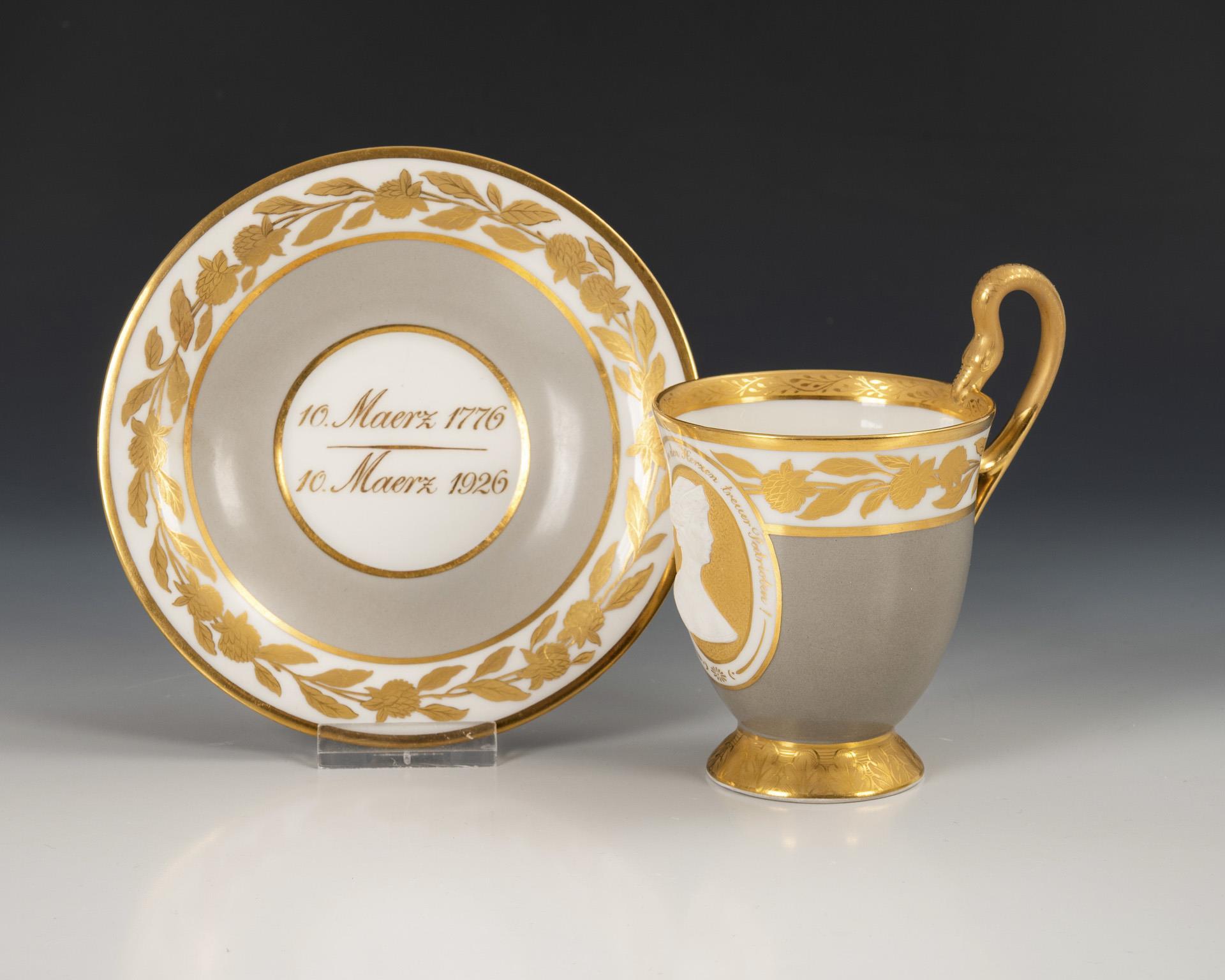 On the occasion of the 150th birthday of Queen Luise (1776-1810). Footed bell cup with swan handle. On the front the bisque relief portrait of Queen Louise in front of a gold vermiculé ground, inscribed with the motto "She lives forever in the hearts of loyal patriots!", gray partial ground under a gold-etched red clover border. In the mirror of the saucer the commemorative dates "10. Maerz 1776 / 10. Maerz 1926", inscribed on the underside "Von hundert Stücken No. 8".