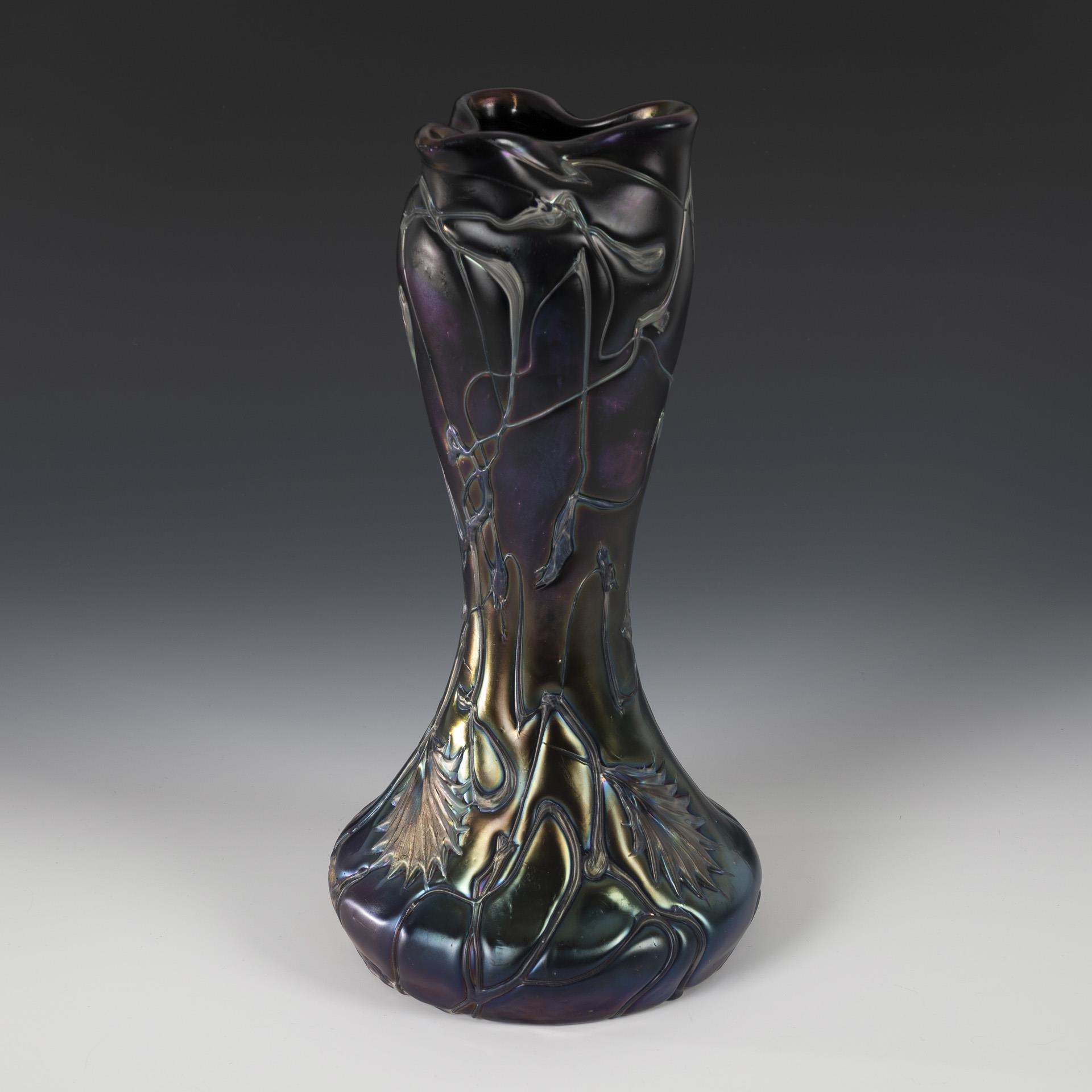 Dark violet glass, silver-yellow fusions on the decoration, iridescent. H 32 cm.