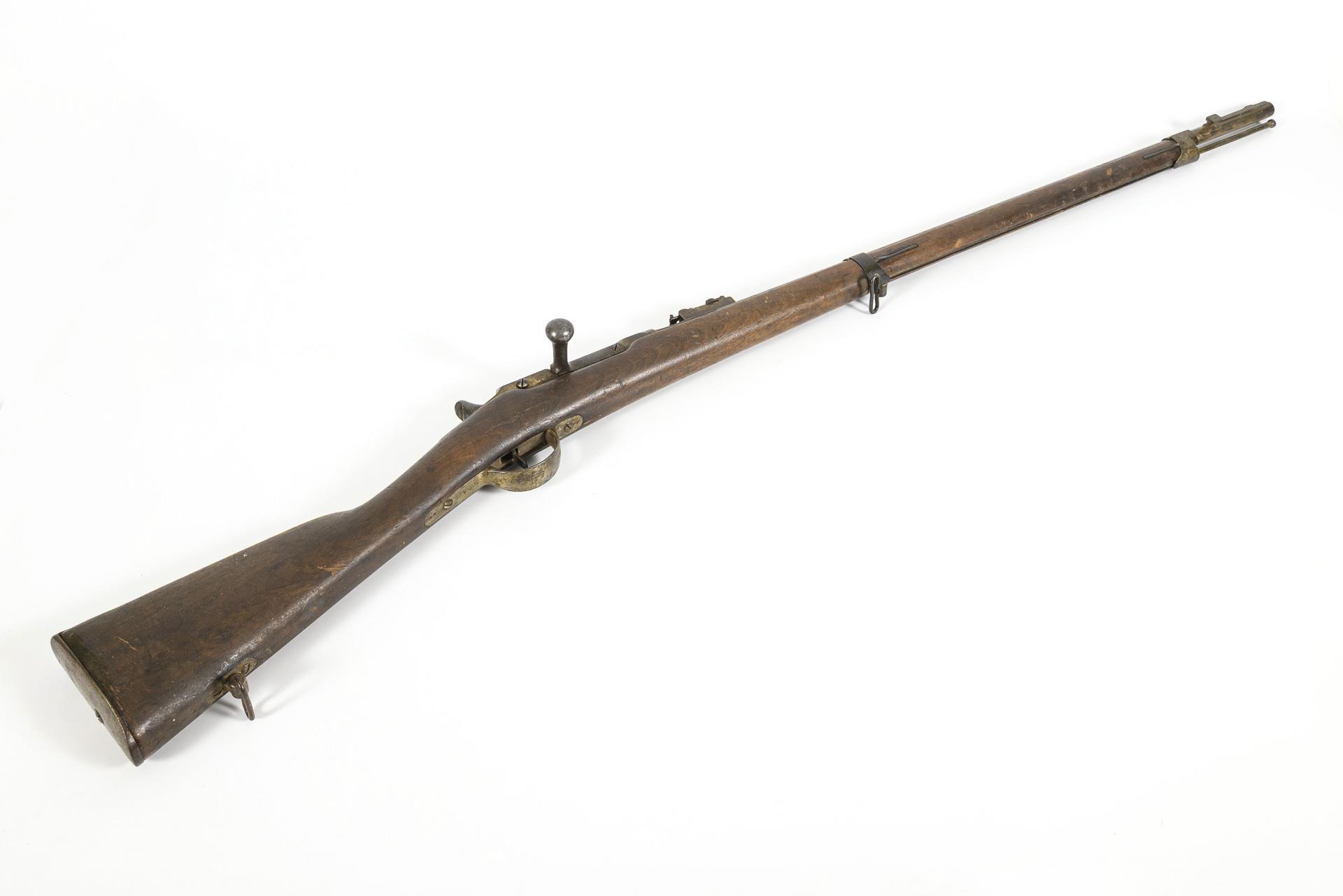 Long, smooth barrel with small caliber, simple wooden stock. Troop acceptance mark 1868. Various marks, on barrel: "ES" in double circle; "M" in circle; "T 1868"; "G"; on bolt: "G 70249"; stock: "K 40450" and stamp-like imprint "MARS MA 18...". Preserved signs of age and use. Bolt movable. Aiming device.