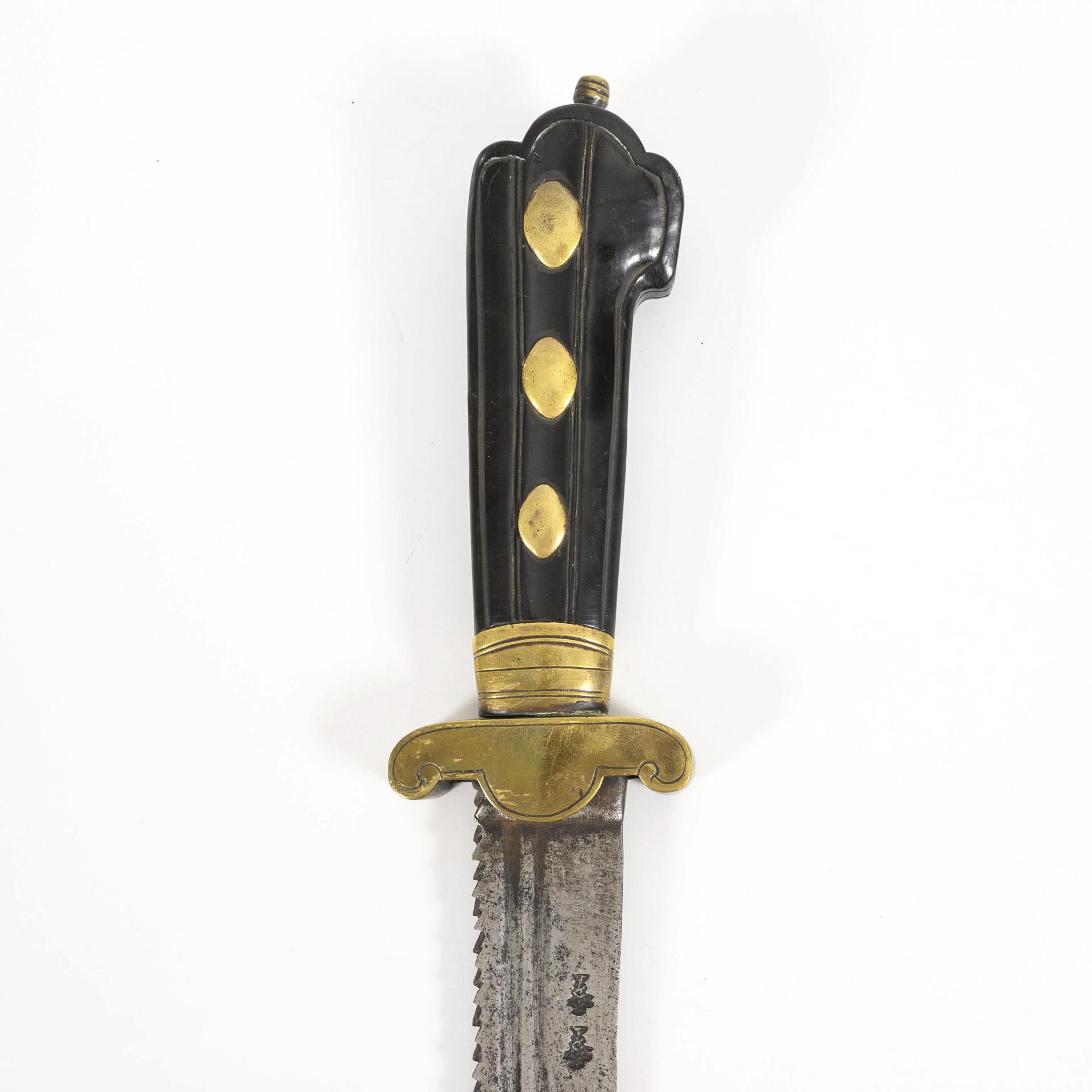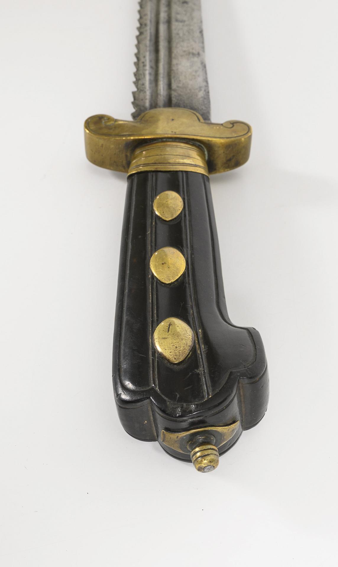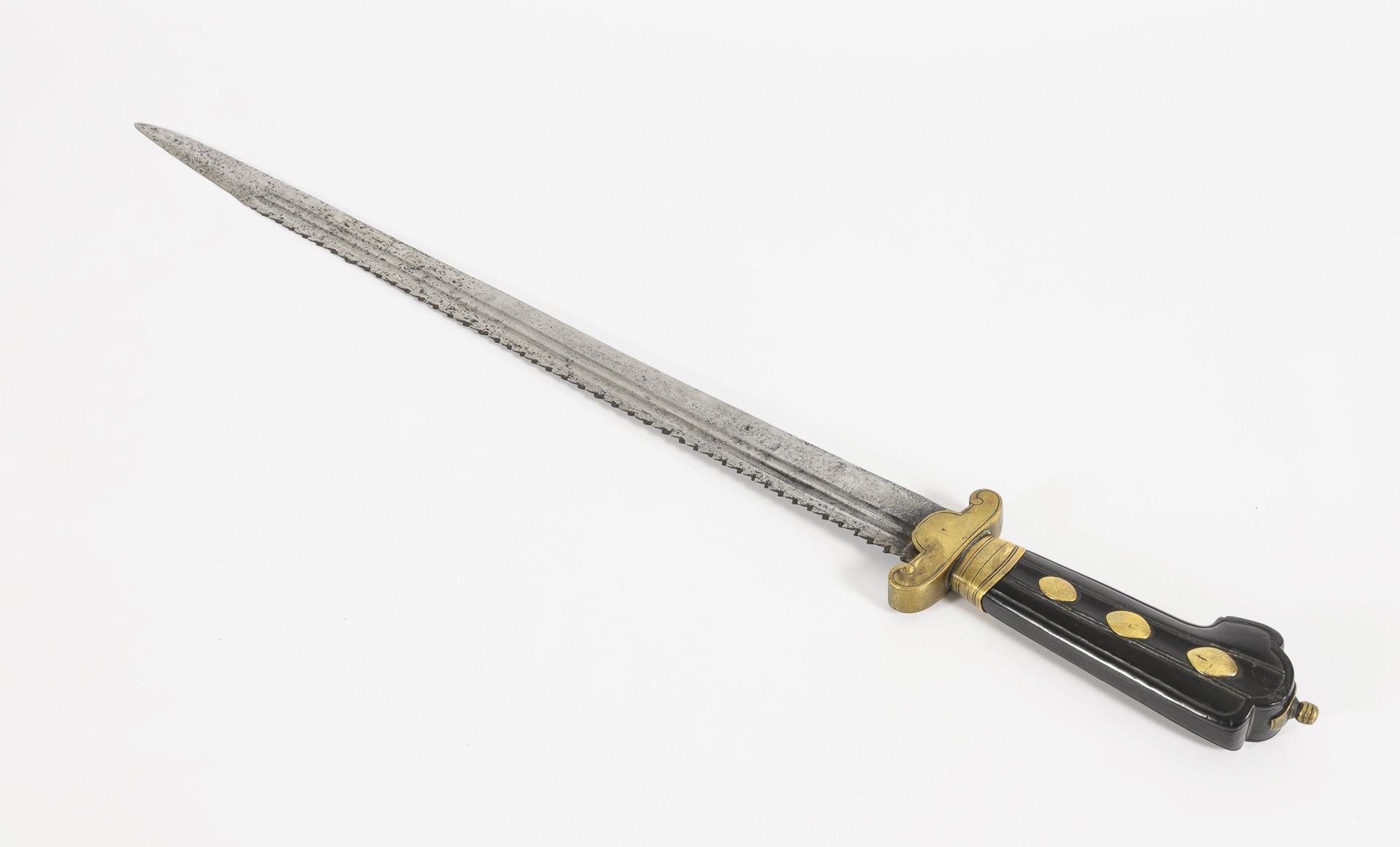 Ebonized wooden grip with grooved decoration, decorative brass rivets and pommel screw, short quillons with scrolls and line engraving. Double fullered blade on both sides with saw back, cutting edge and fuller, point in the midline. Minor chipping on the grip, traces of rust on the blade, otherwise hardly any signs of age/use.