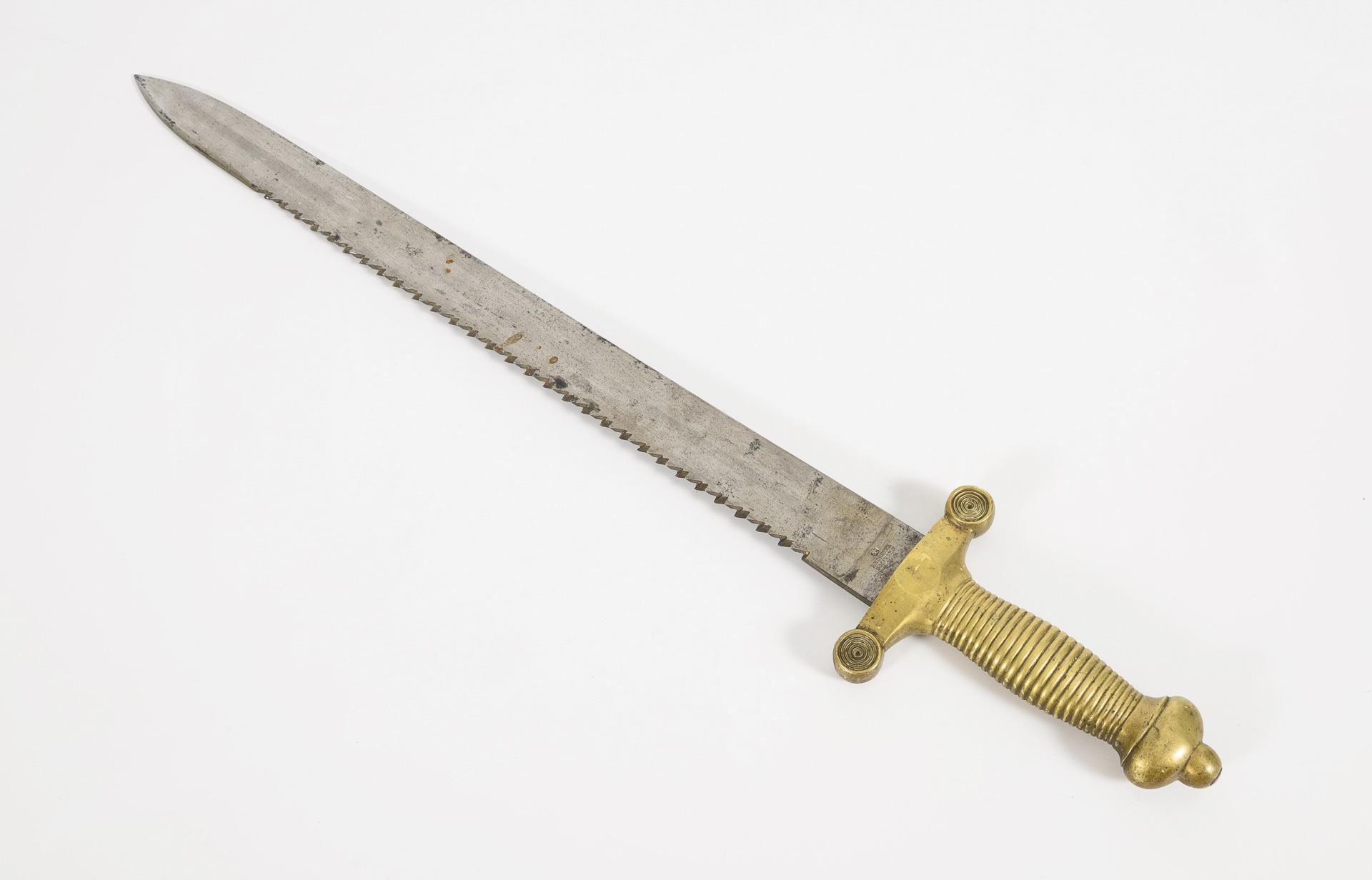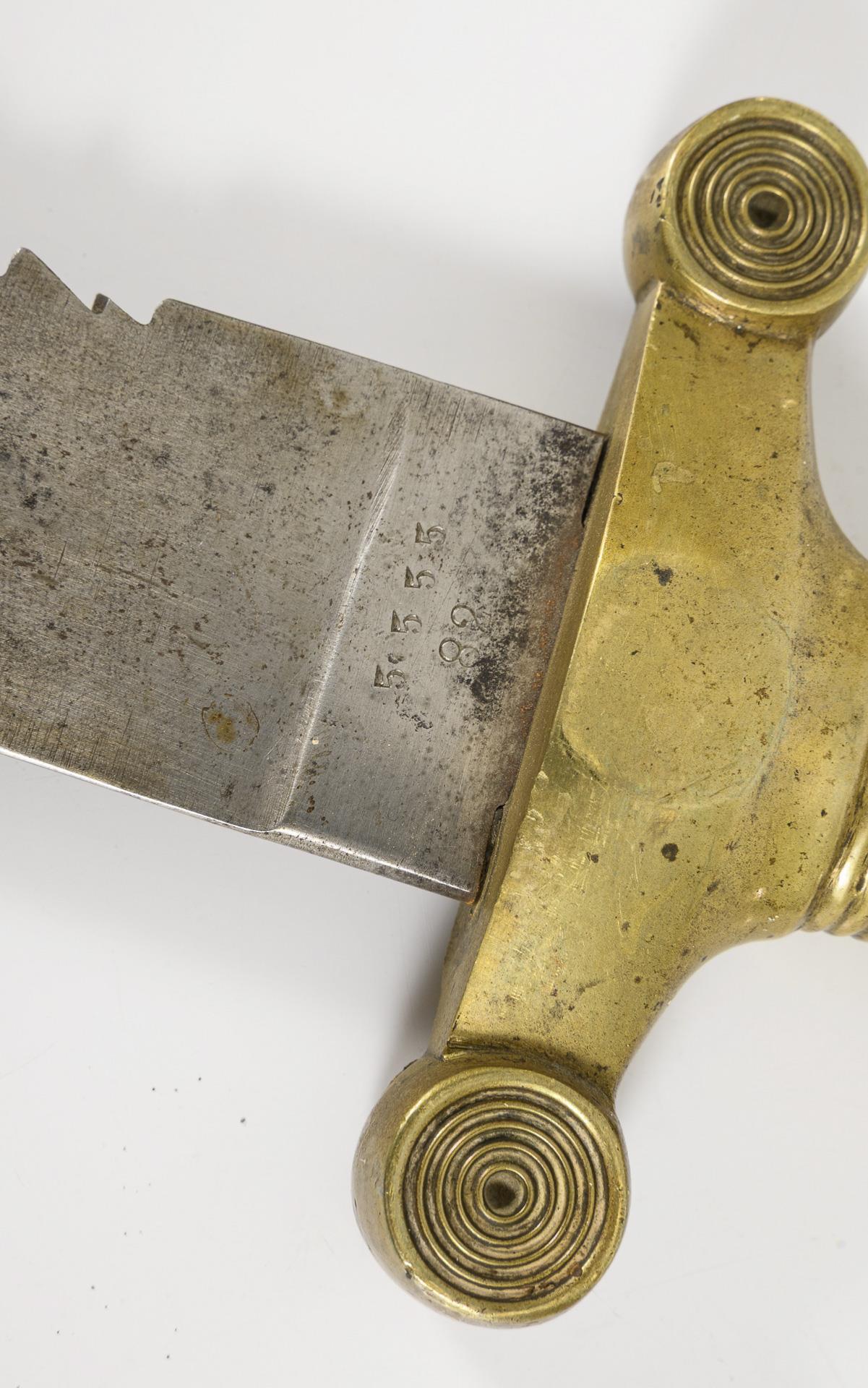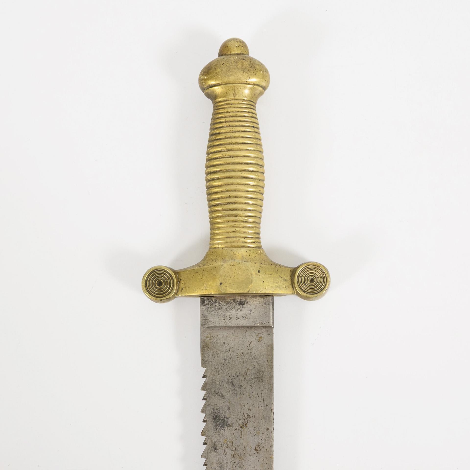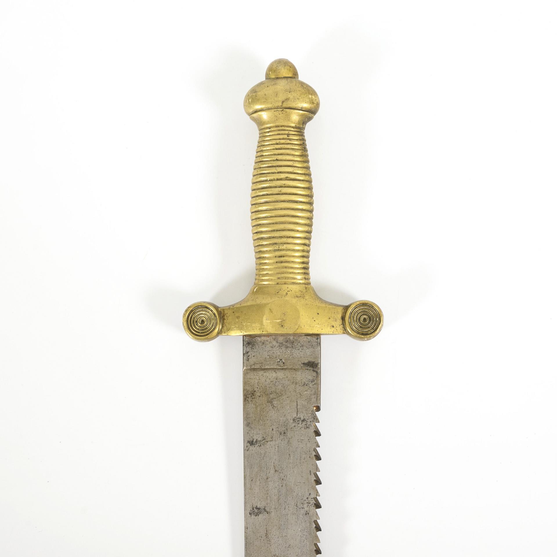 Massive brass grip with fluted grip and grooves on the straight quillons, blade with saw back and central point. Some signs of age/use.