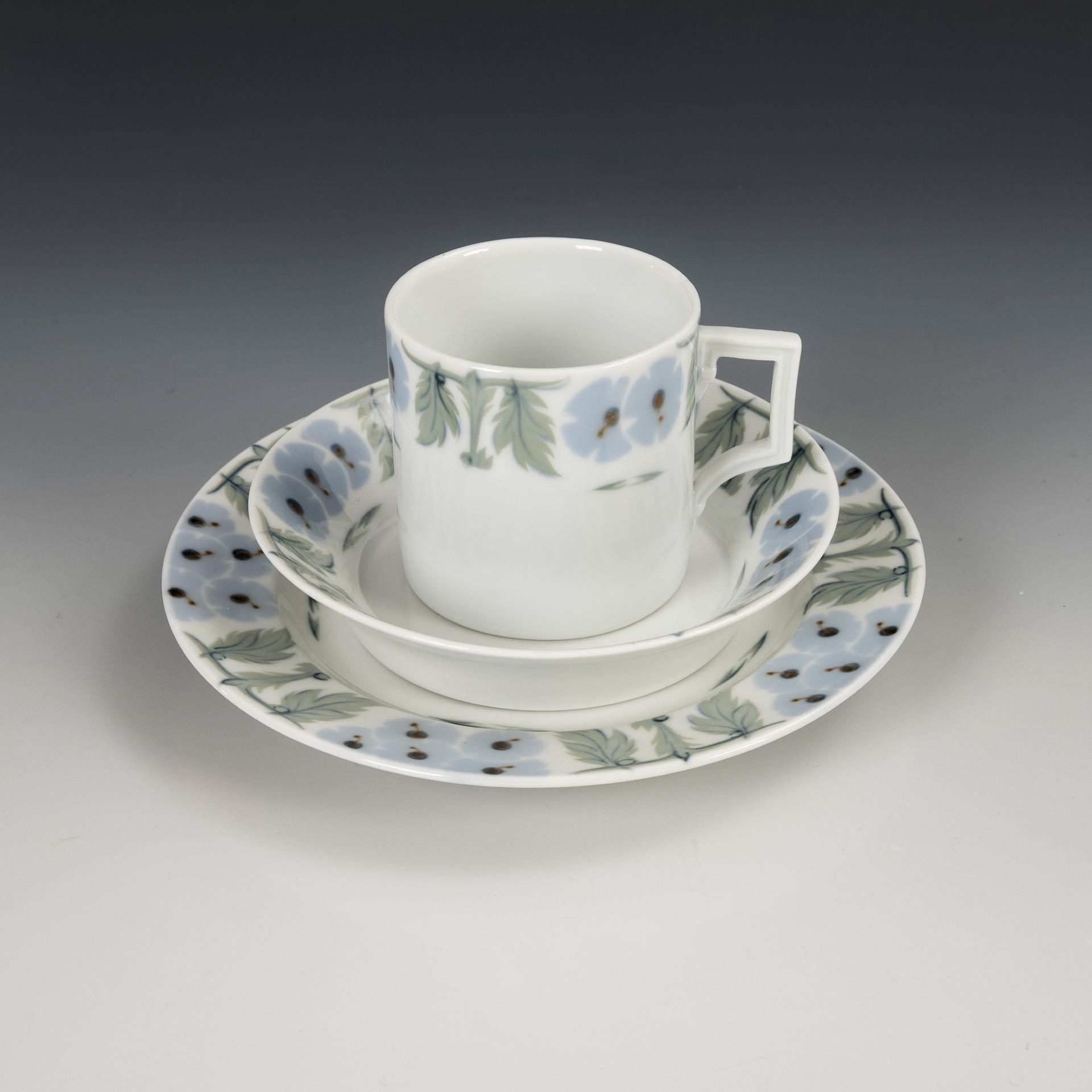Underglaze painting. Cup (h 6.5 cm), saucer (Ø 13 cm) and cake plate (Ø 17 cm).