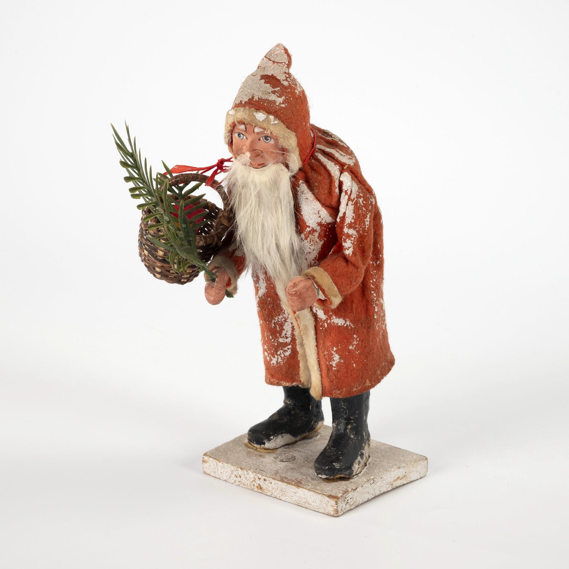 Mass figure with red felt coat and white beard made of real fur. Pannier missing. Traces of age, basket and fir branch replaced.