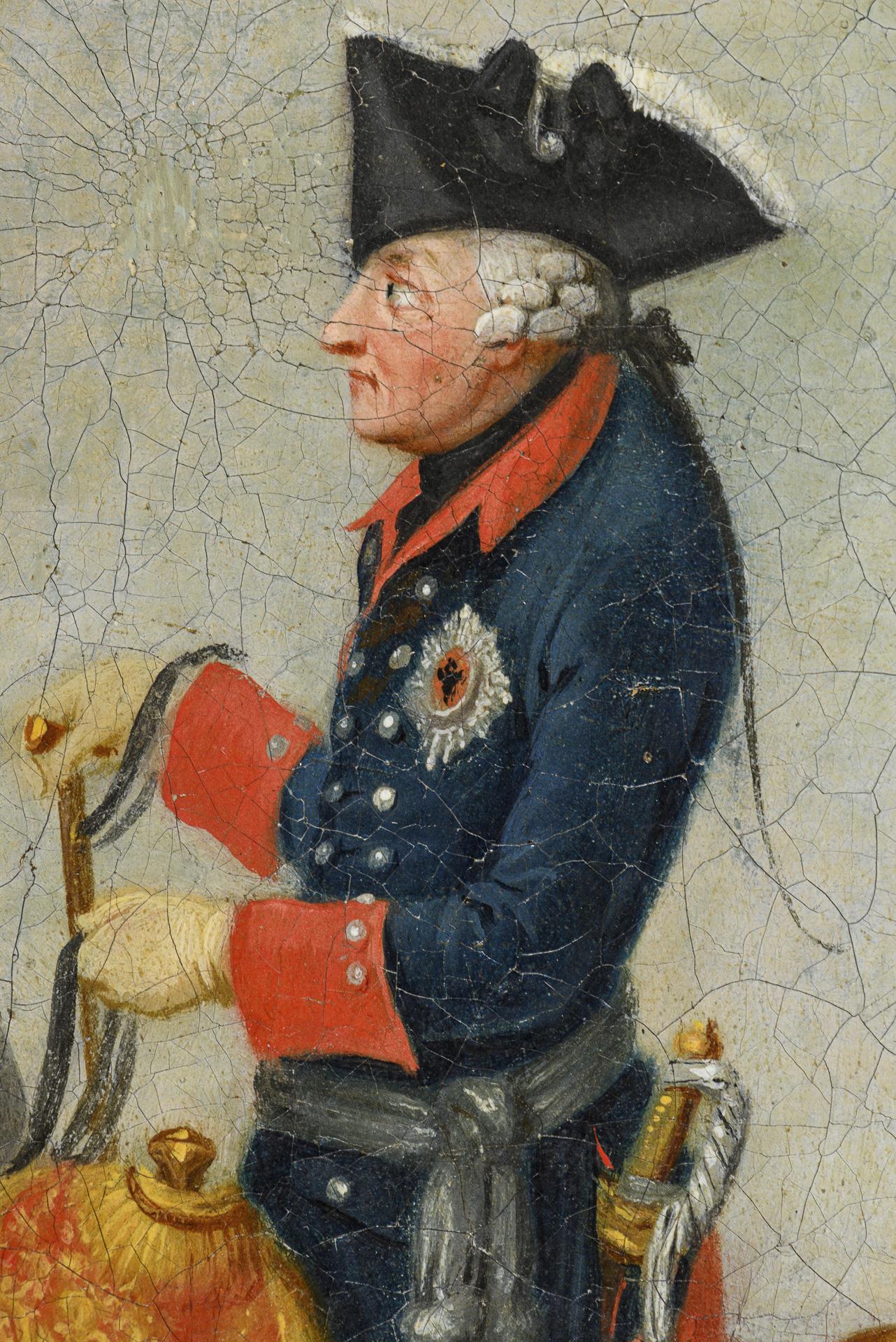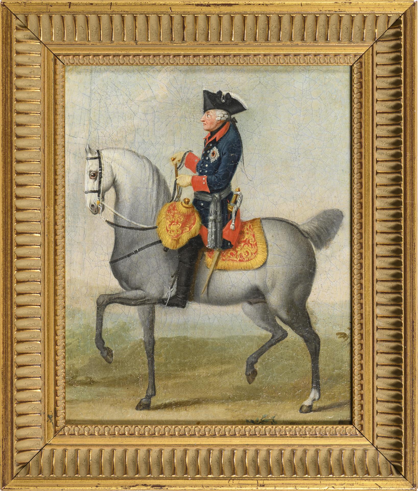The Prussian king on a gray horse in a flat landscape. Traces of age.