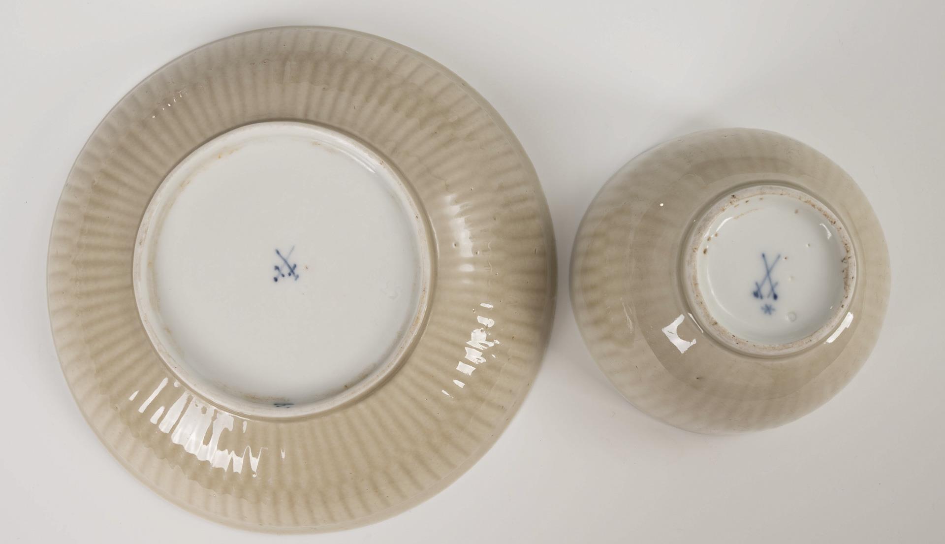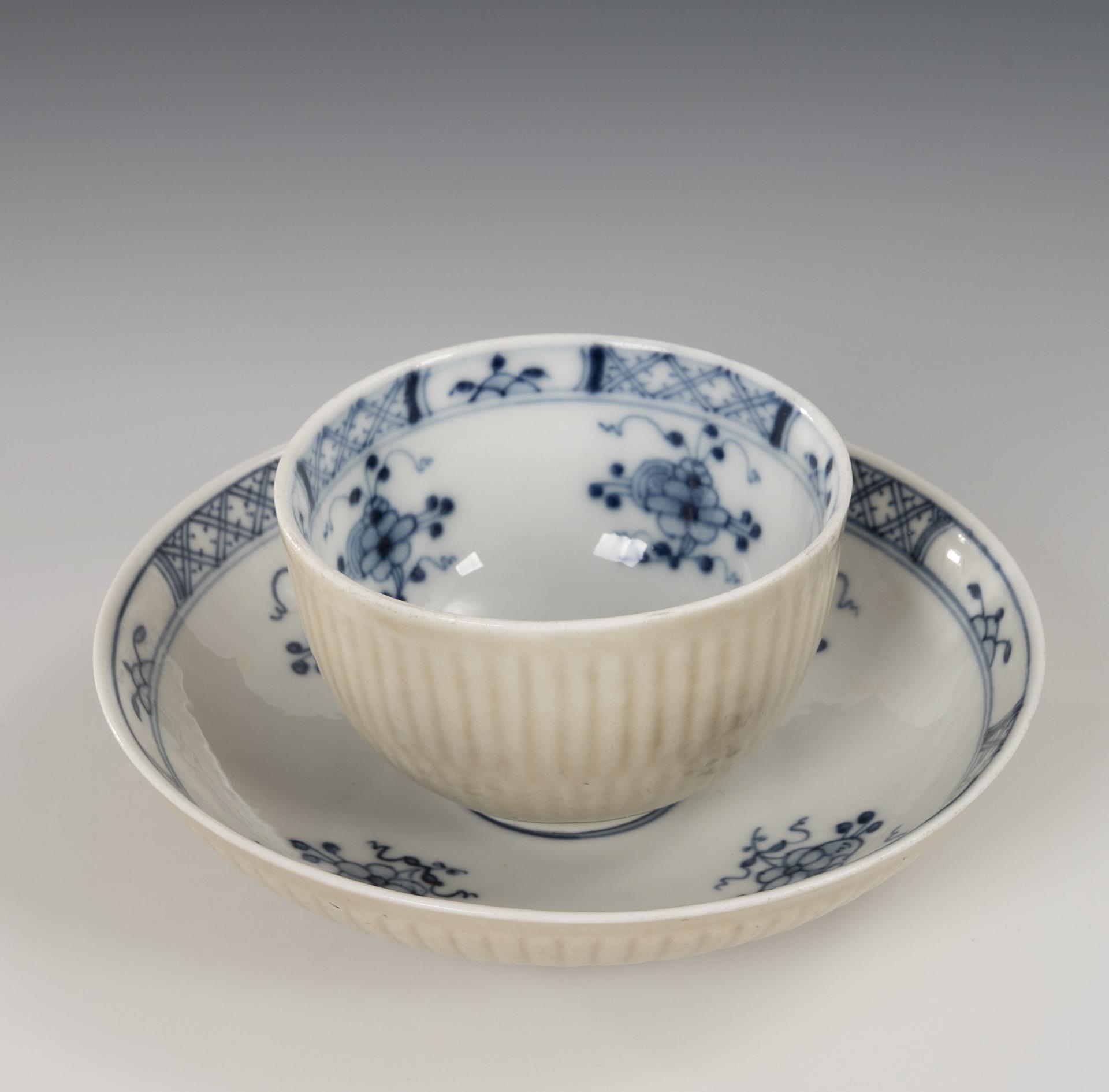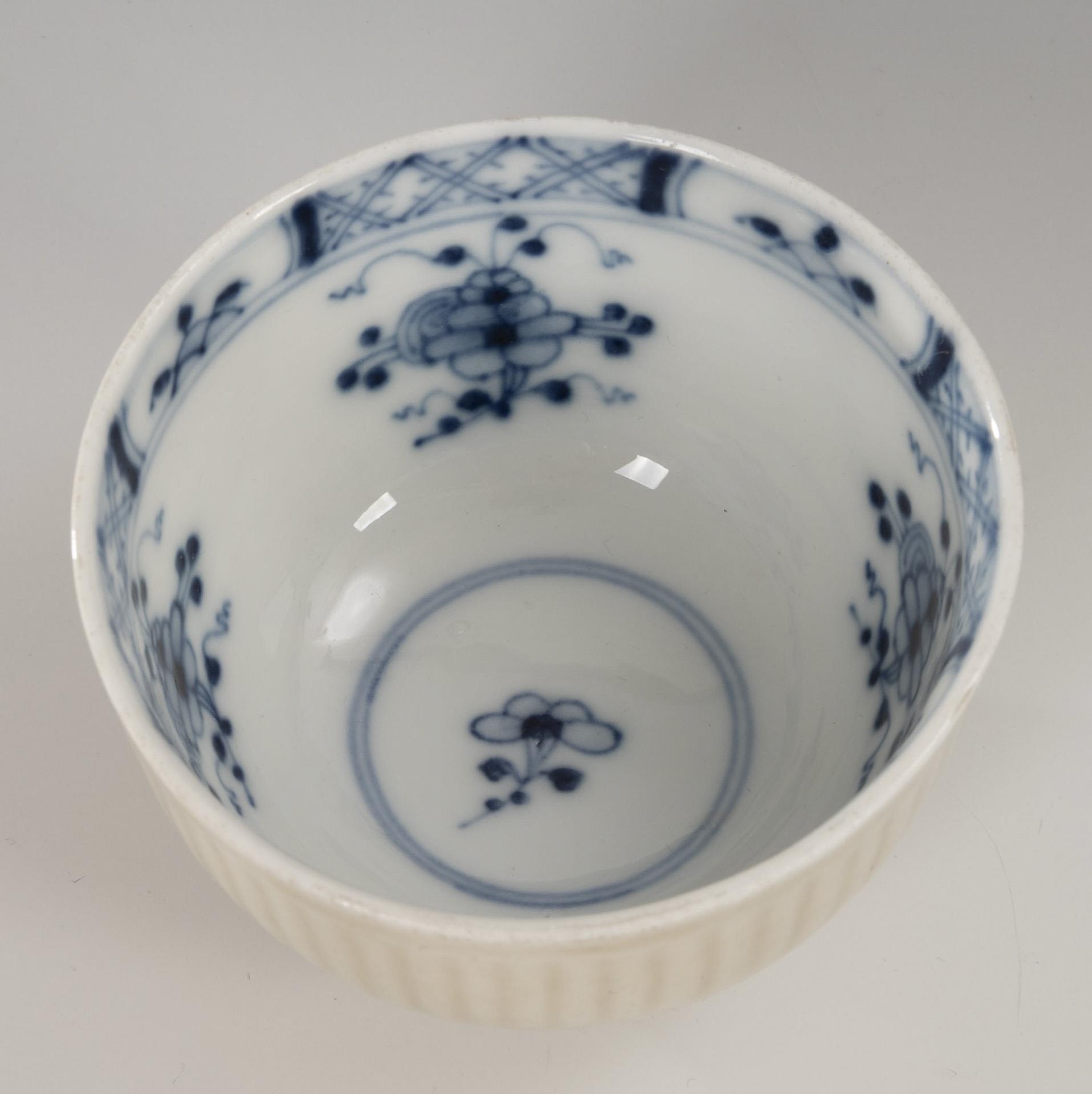 Underglaze blue painting, celadon-colored wall fond. Cup (h 4.5 cm), saucer (Ø 13 cm).