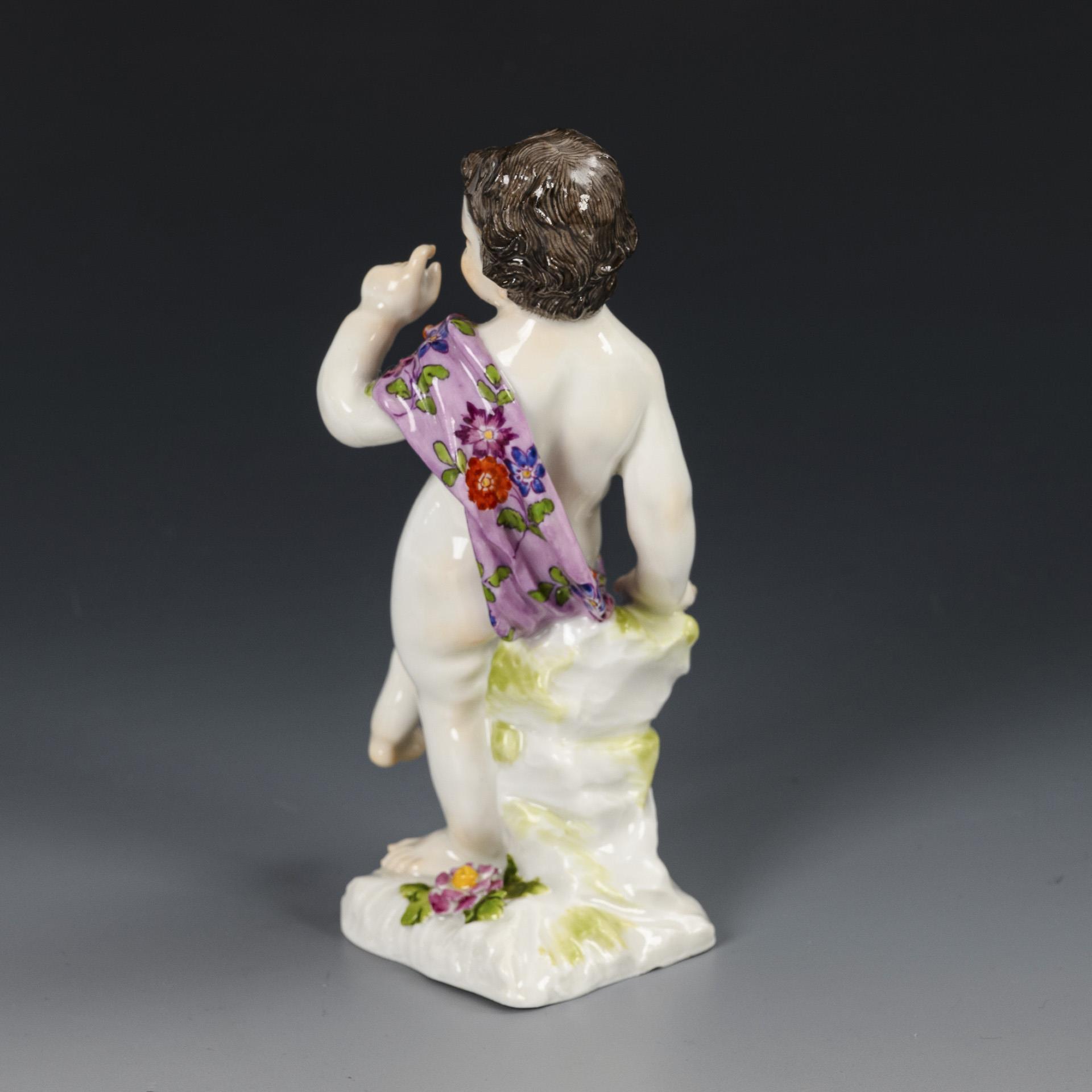 Putto standing on a flower-covered plinth on a piece of rock. Minimal chip to the edge of the plinth, left index finger restored.