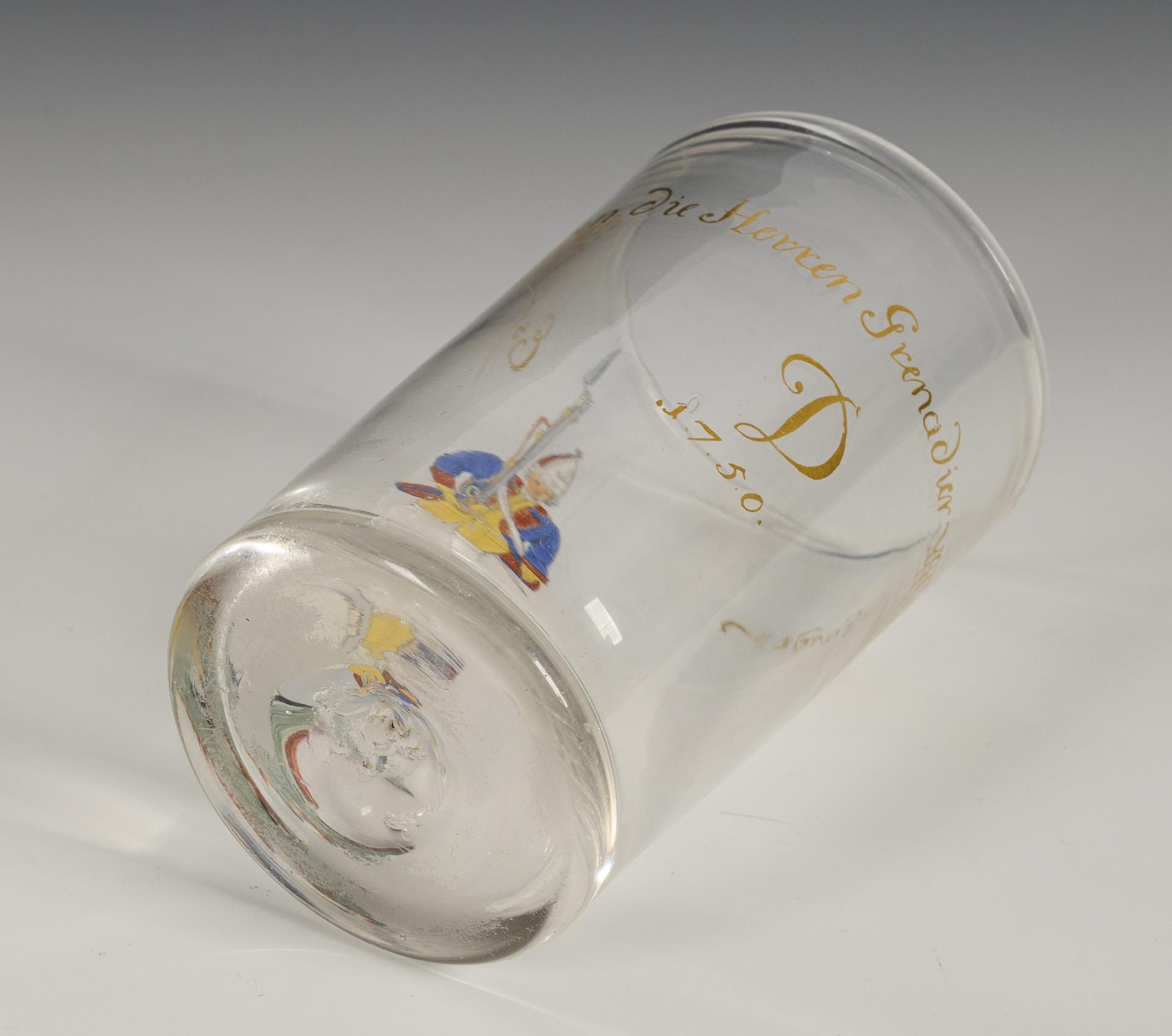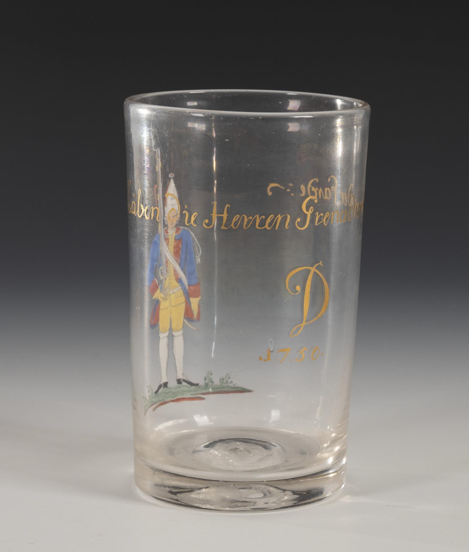 Cylindrical beaker with a polychrome enamel-painted depiction of a soldier on the front. Verso the gold inscription and date "Es Läben die Herren Grenadier von der Garde [...] D 1750"; tear-off. 1 edge with chip (L 7 mm).