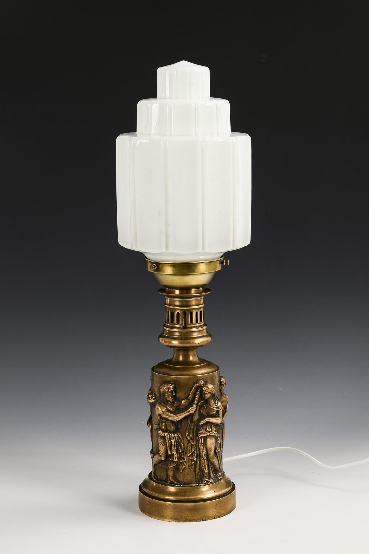 High bronze base, decorated all around with antique relief (hair sacrifice scene?). Faceted glass body with stepped finial above the top with lattice. Probably electrified kerosene lamp. Disciples wired, working.