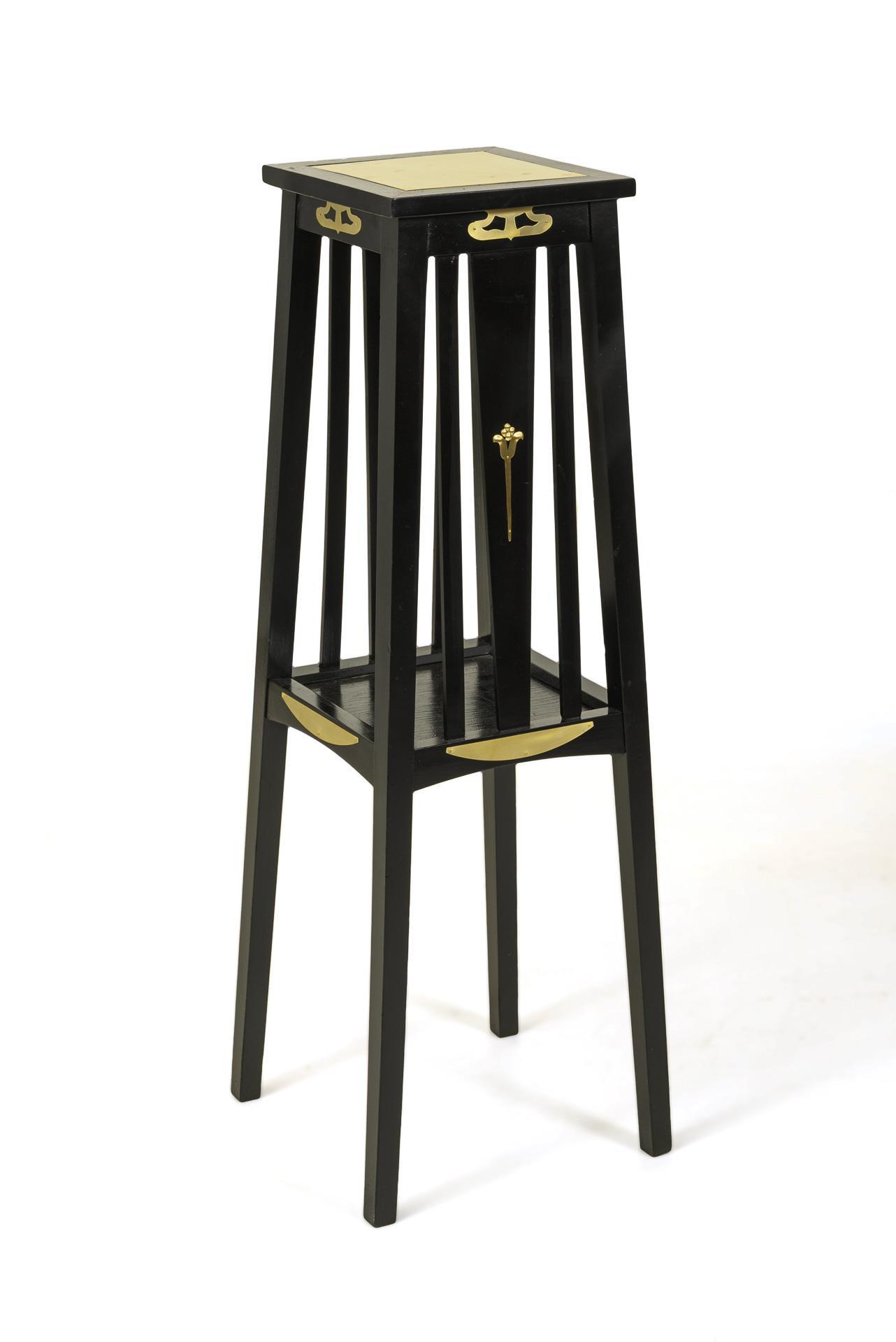 Pedestal with square top plate with inlaid brass plate, on 4 conical square legs with vertical struts and shelf. Floral stylized brass fittings. Restored, fittings probably replaced. Minimal signs of wear, 1 small edge chip.