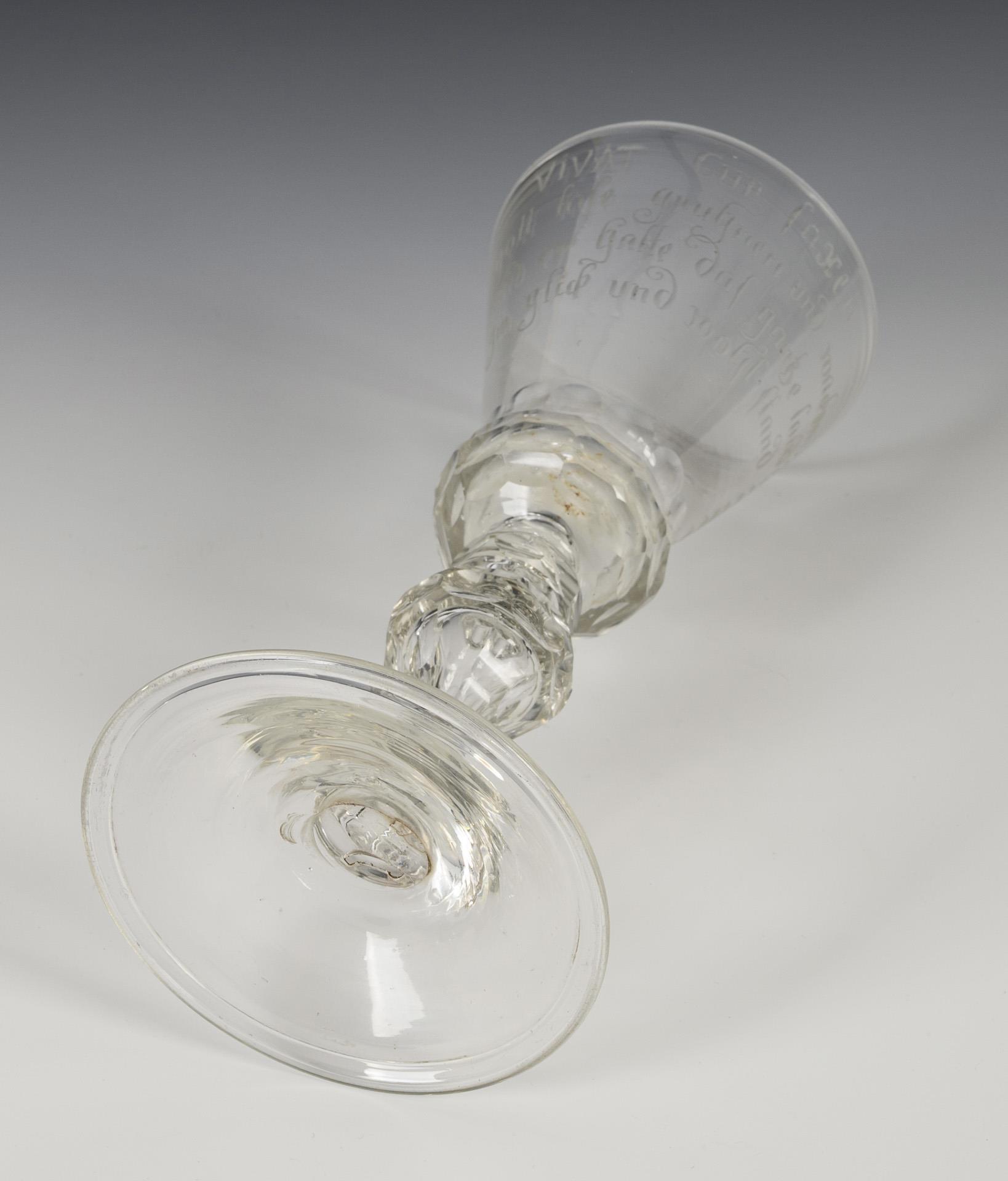 Conical bowl with honeycomb-facetted, bulbous base and pierced air bubble in the bottom, honeycomb-facetted baluster hollow shaft, slightly rising round foot; with turned-down rim; pontil mark. On the front the Saxon coat of arms flanked by palm fronds, on the reverse the engraved motto "VIVAT Cur saxen gott lase gruhnen und wachsen vnd er halte das gantze land Im glick und wohl stand". Without lid.