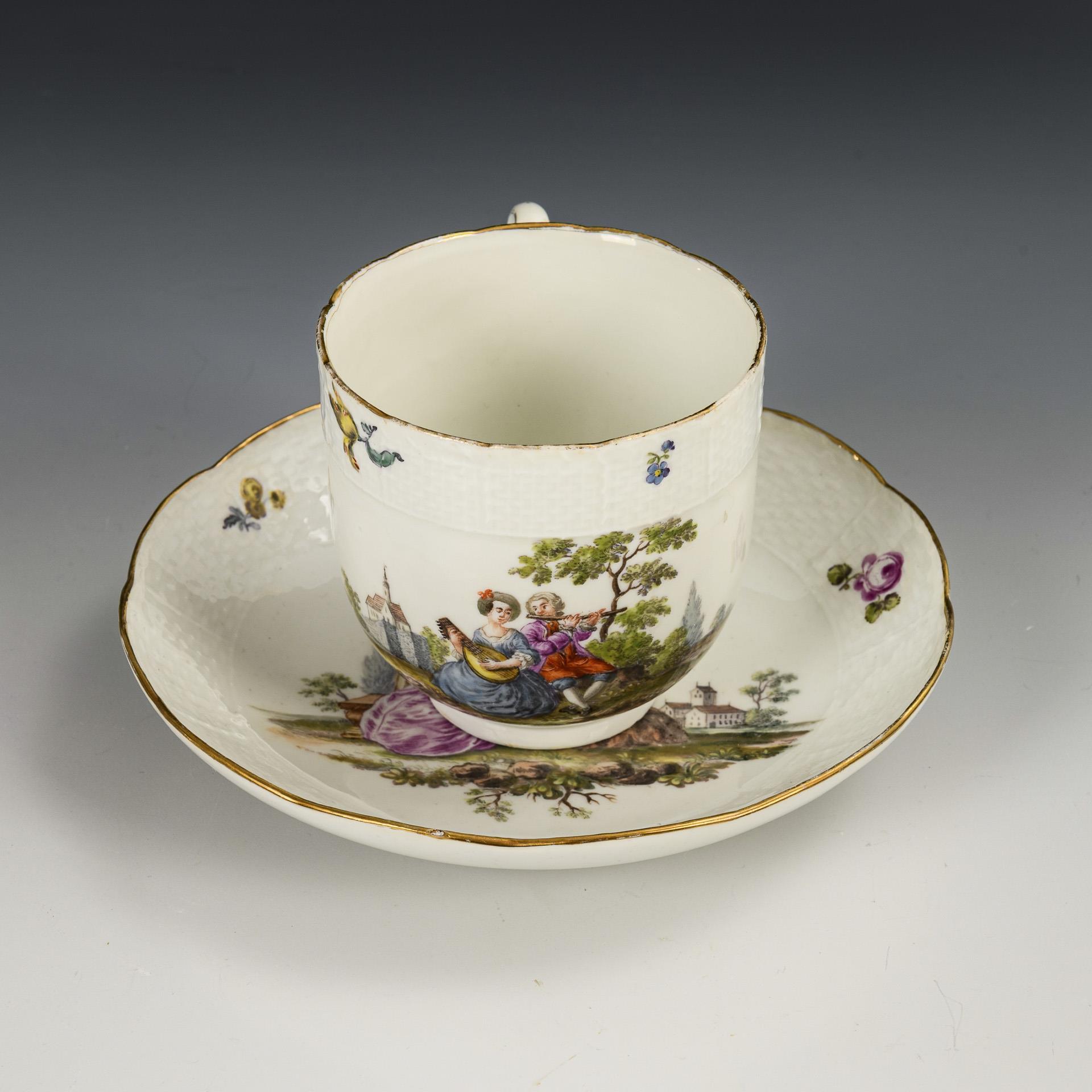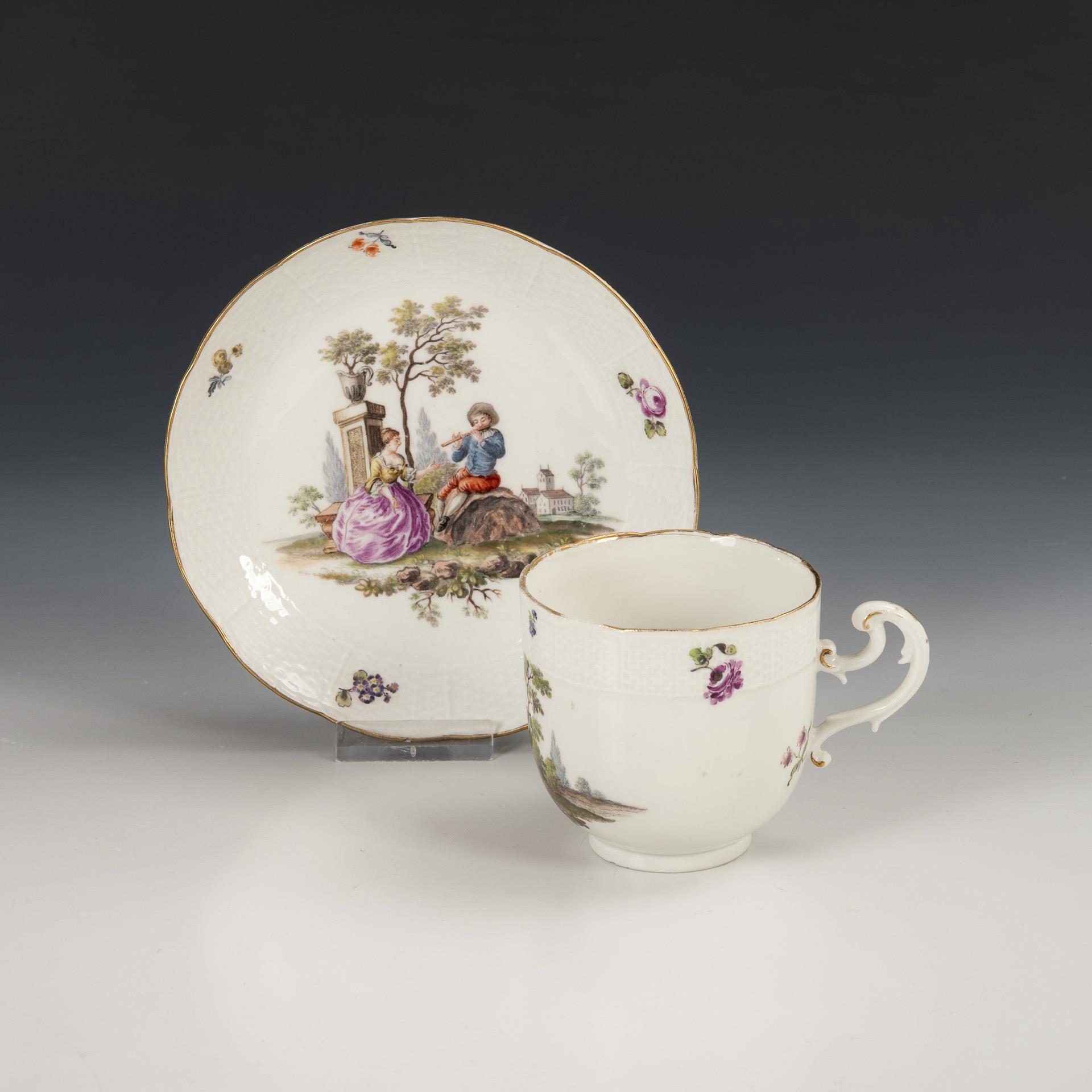 Bell-shaped cup with rocaille handles and the relief decoration "Altozier". The cup and saucer depict small park landscapes with a gallant couple. Rubbed gold.