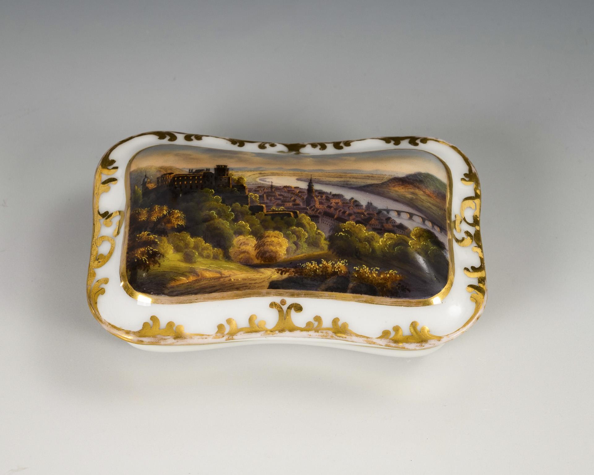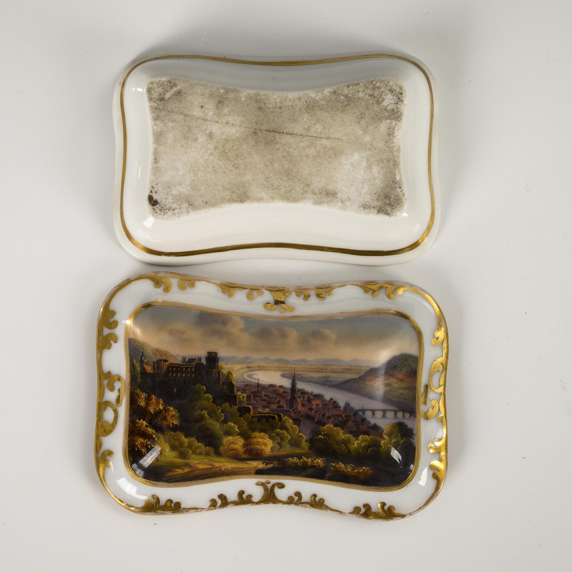 Rectangular Fidibus box with a rubbing surface on the inside of the lid. On the lid a view of the city of Heidelberg with a view of the castle. Minimal gold wear.