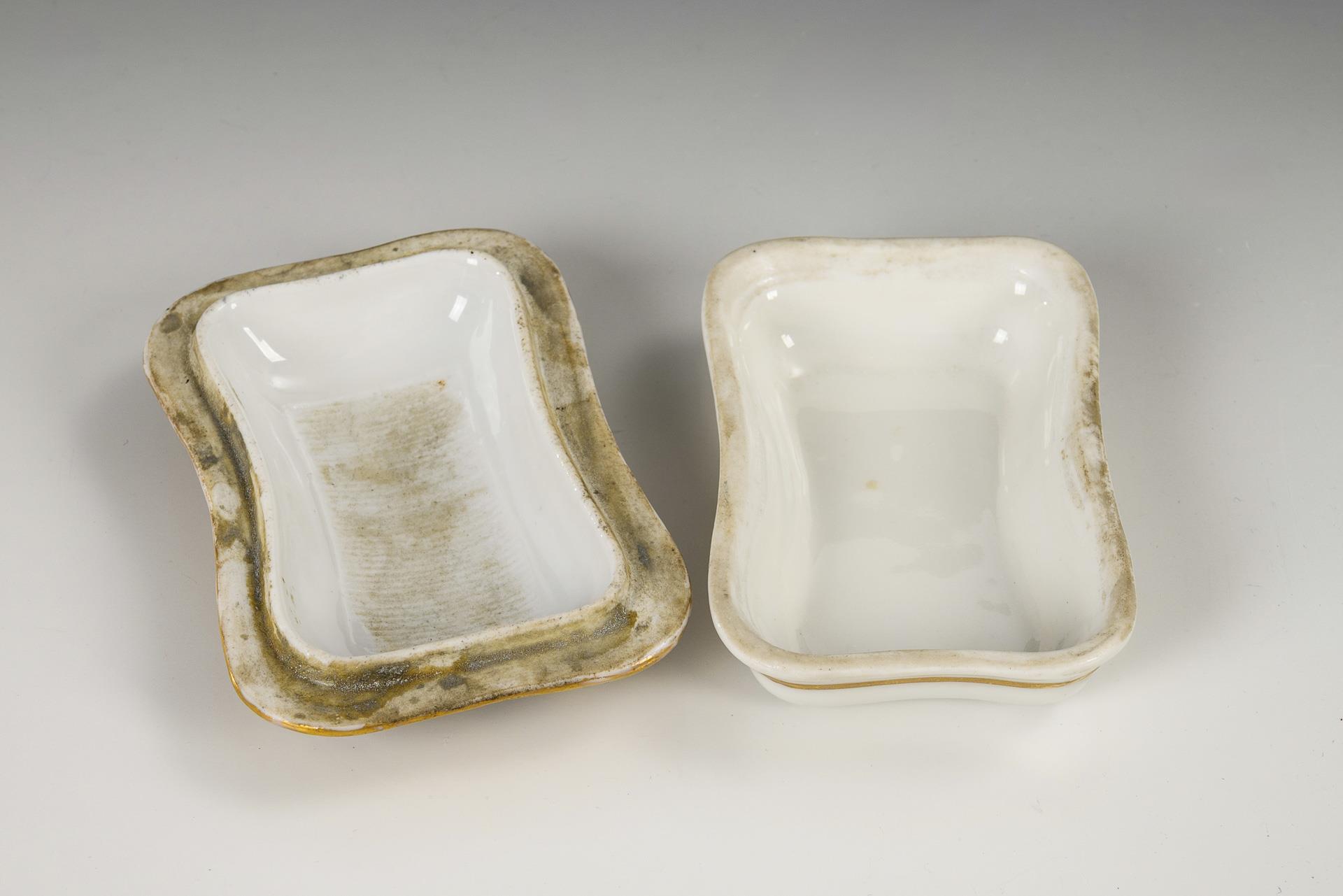 Polychrome painted, decorated with gold. 3.5 x 9.5 x 6.5 cm.