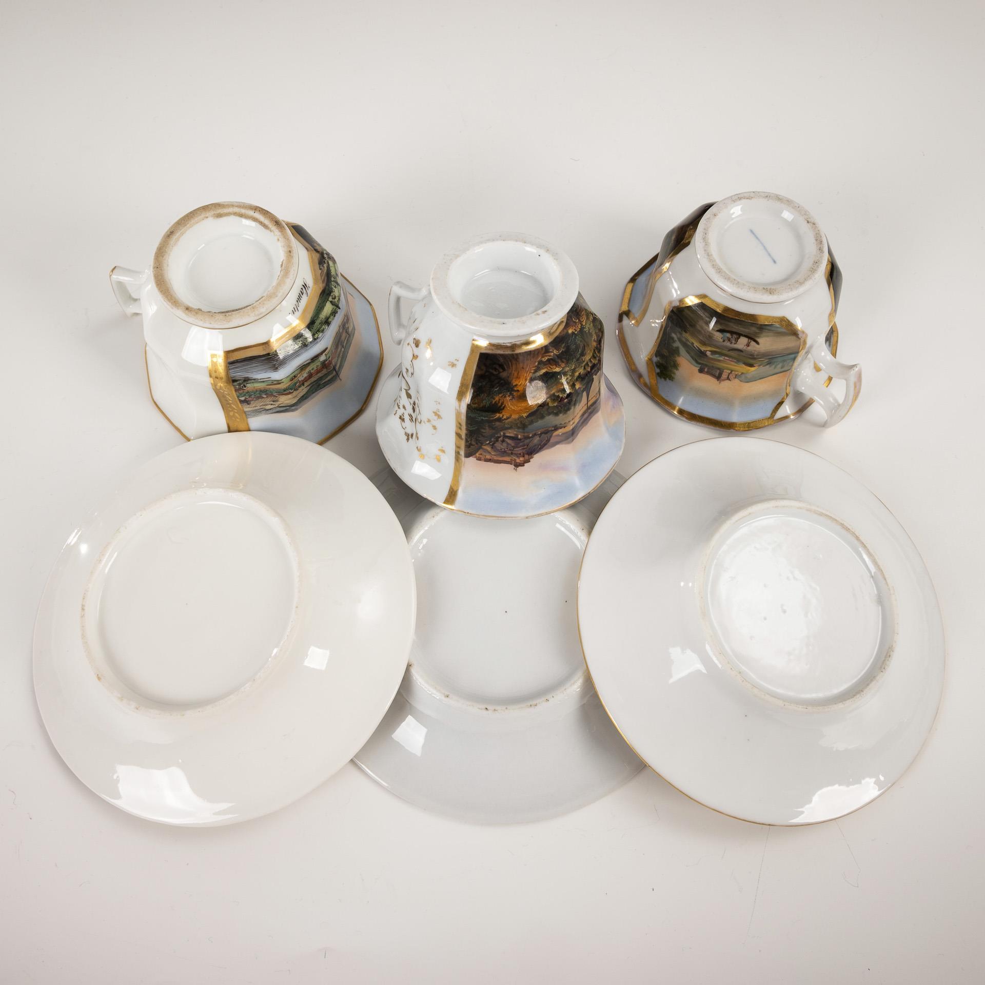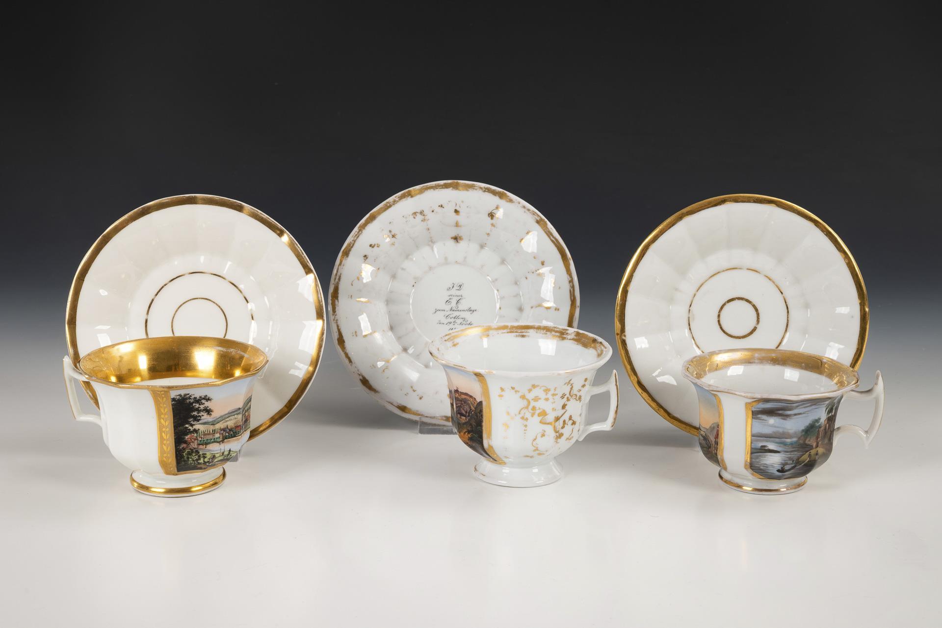 Polychrome painted, decorated in gold. 3 cups (h 6-6.5 cm), 3 original saucers (Ø 14-14.5 cm).