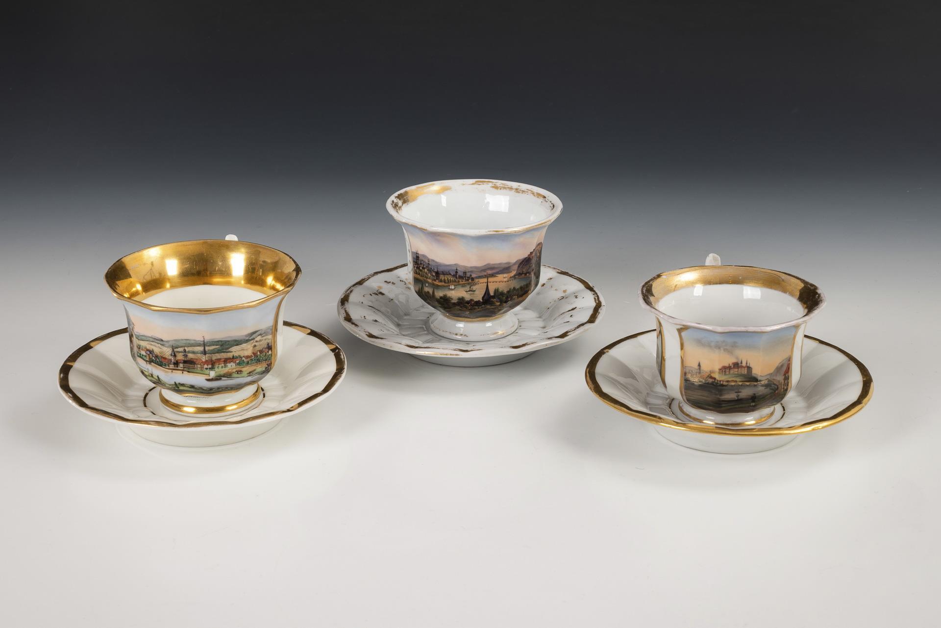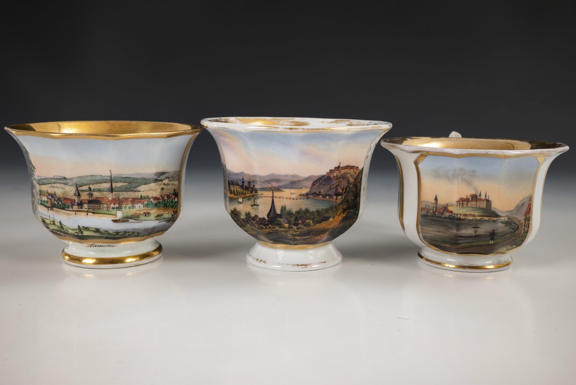 Footed, polygonal bell-shaped cups with tapering handles. 1x with a view of Koblenz and the Ehrenbreitenstein fortress, 1x with a view of Hamelin and 1x with three different views, including a view of Meissen. 1x gold rubbed.