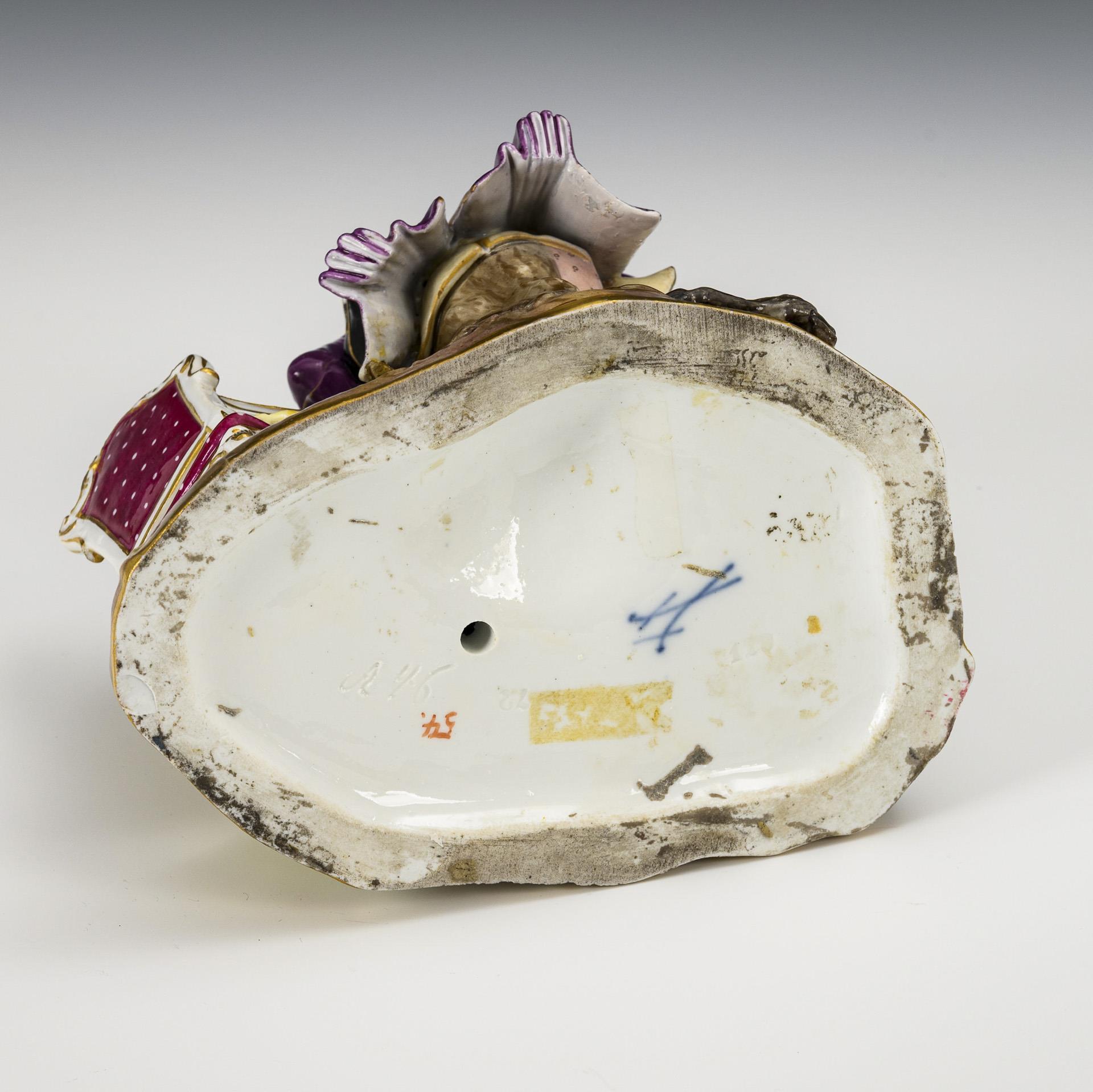 Also known as the "Erbschleichergruppe". An old woman sitting in front of an open money chest, showing her fortune to a young man, a faun boy standing by the chest. Minimal chip to the edge of the base, faun boy, bow, right hand and left shoulder of the gentleman and right hand of the woman restored.