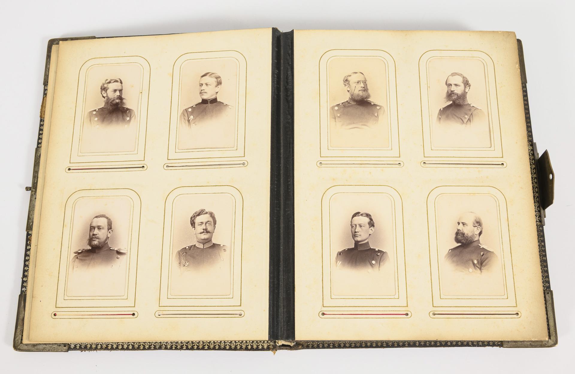 104 photographs, mostly in cdv format, mainly people in uniform, list of names with regimental names on endpapers, often aristocratic names. Also some images of civilians. In leather album with engraved plaque.