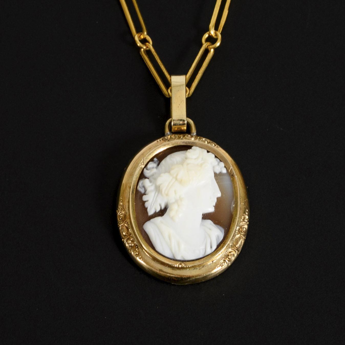 Cameo with a profile of a bacchante in an antique-style robe with a wreath of vine leaves in her hair, turned to the right, set in a discreetly ornamented gold frame. The cameo on the reverse with traces of probably earlier brooch fitting, was likely re-worked into a pendant more recently, does not sit quite firmly in the setting, holds securely.