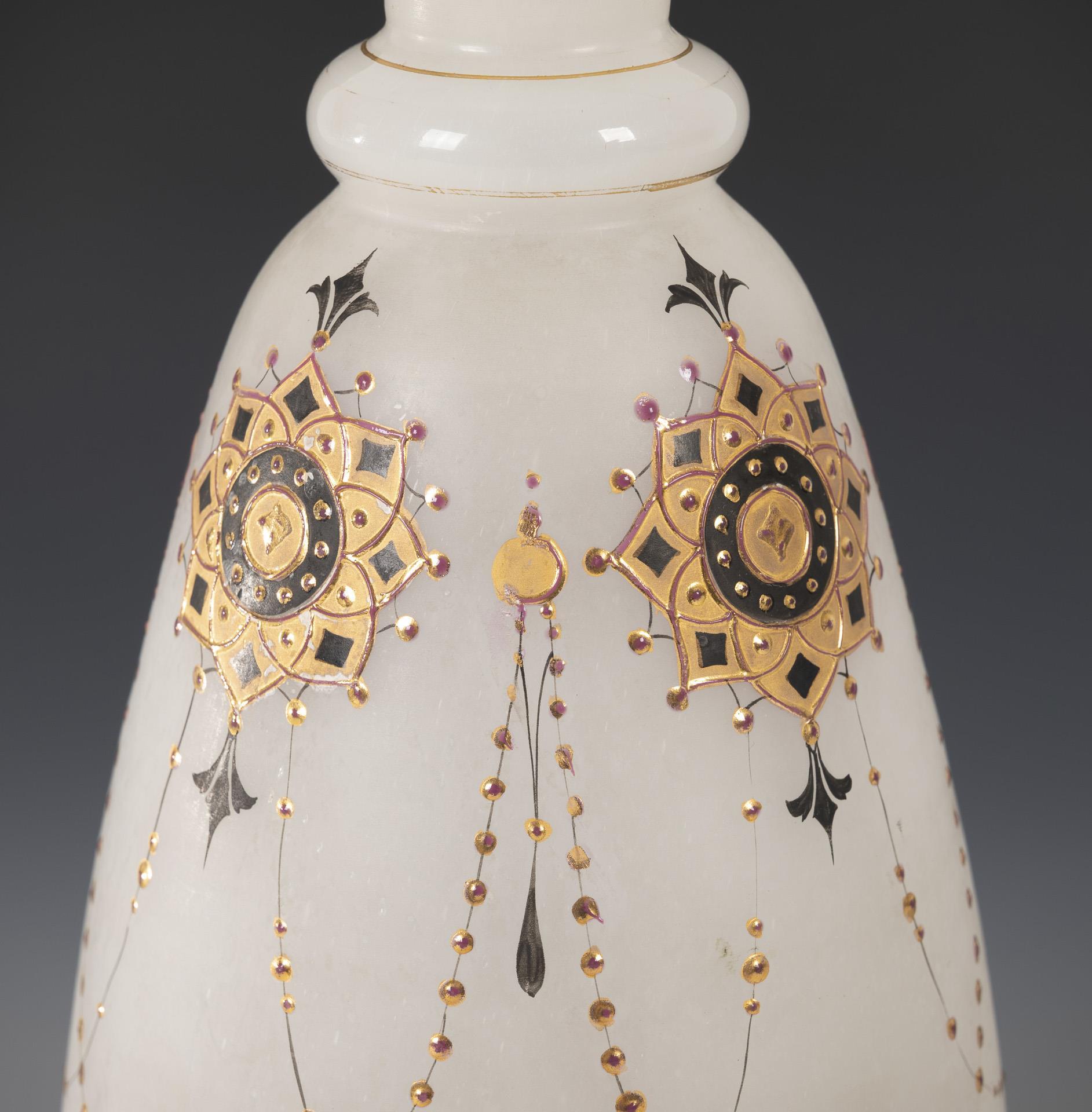 White alabaster glass, relief enamel, gold. H 35 cm.