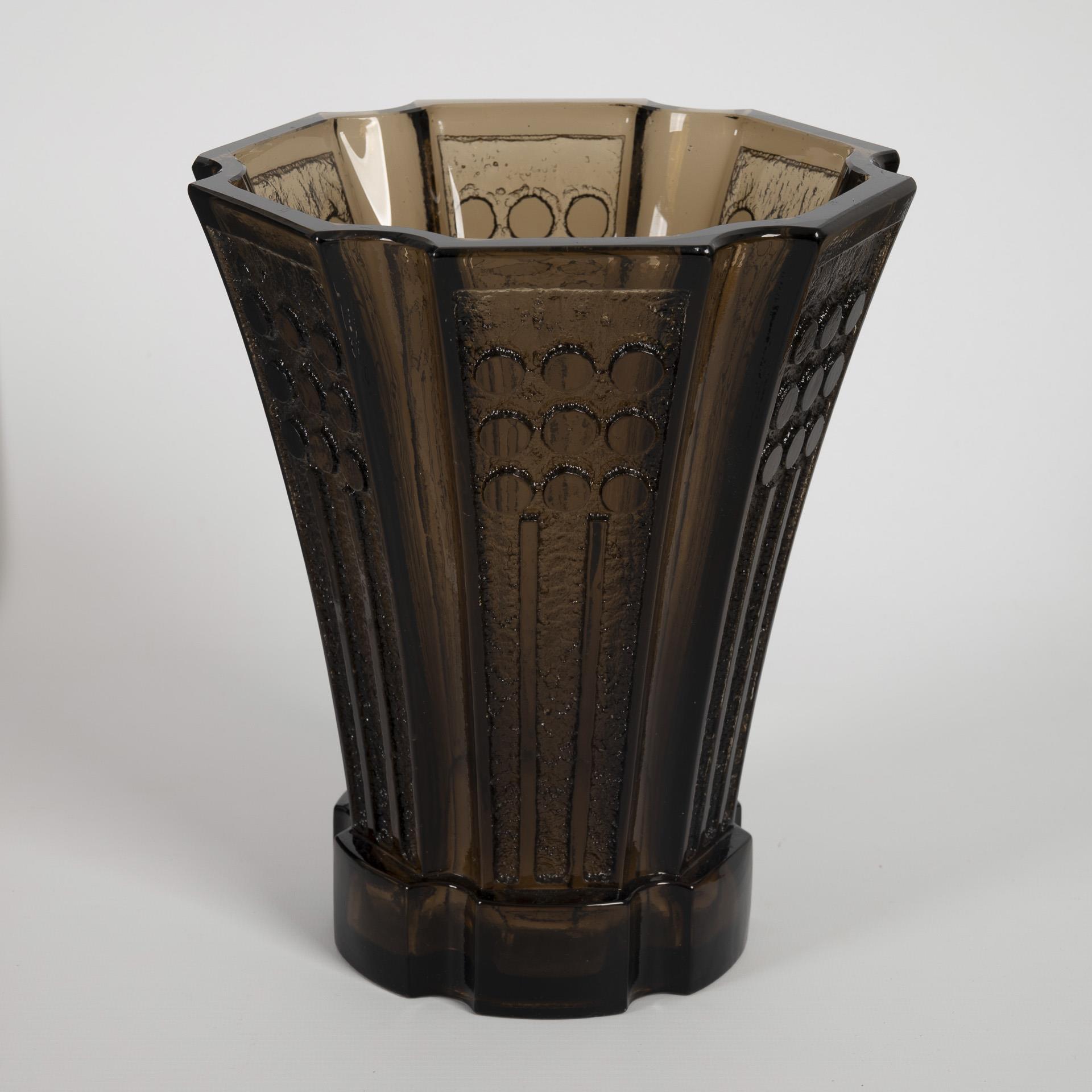 Hexagonal crater vase made of smoky brown, mold-blown glass. Surrounded by a six-fold repeating, ice glass-like etched geometric decoration.