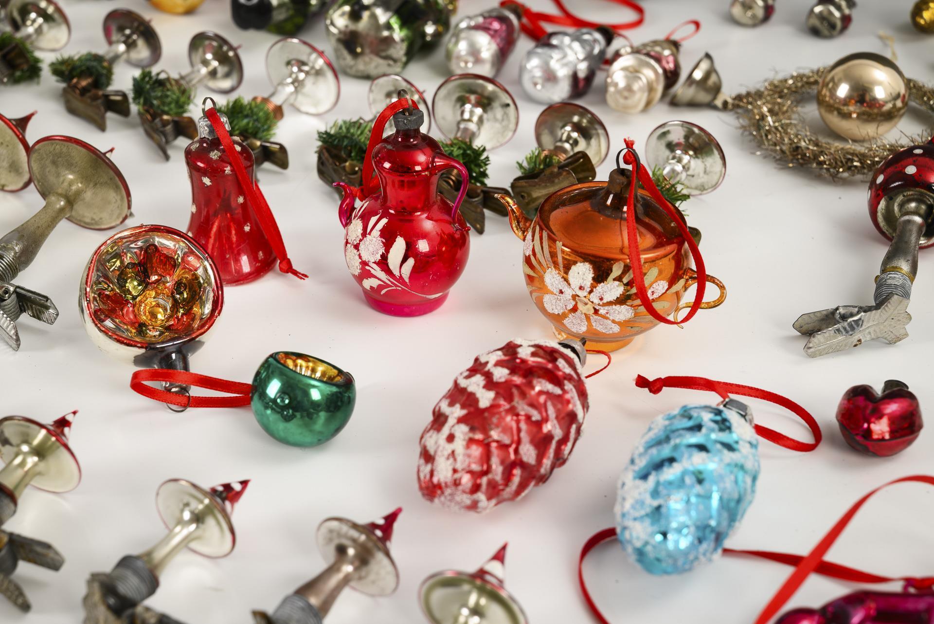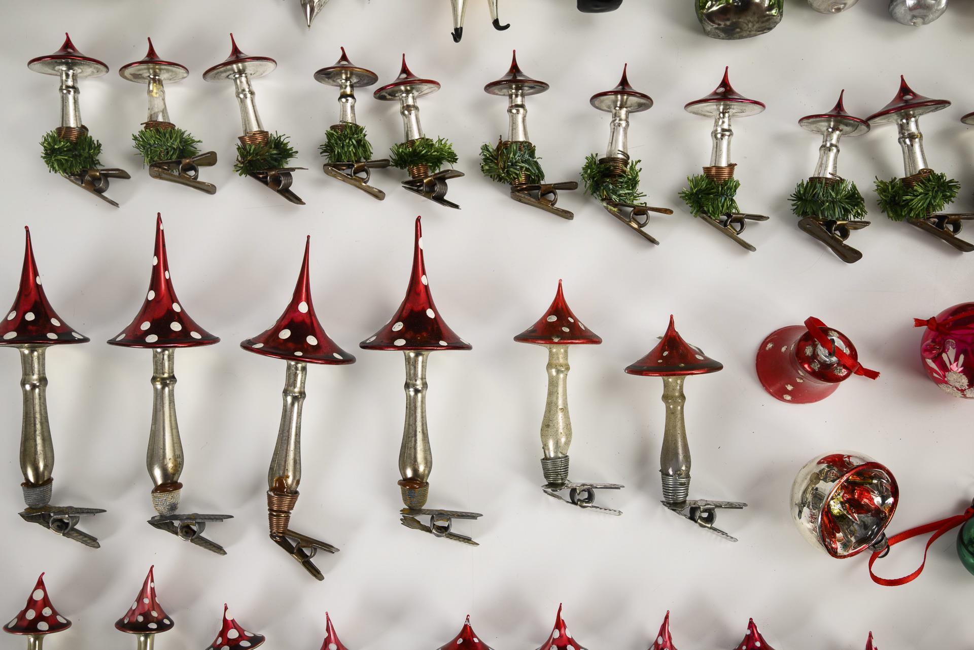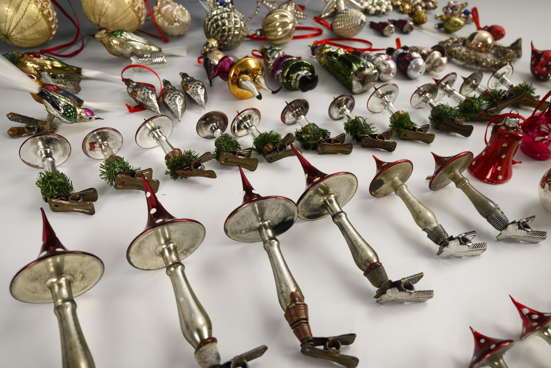 Glass decorations for the Christmas tree designed in the old style, including mushrooms, birds with fiberglass tails, Santa Clauses, some parts in Gablonz style etc.