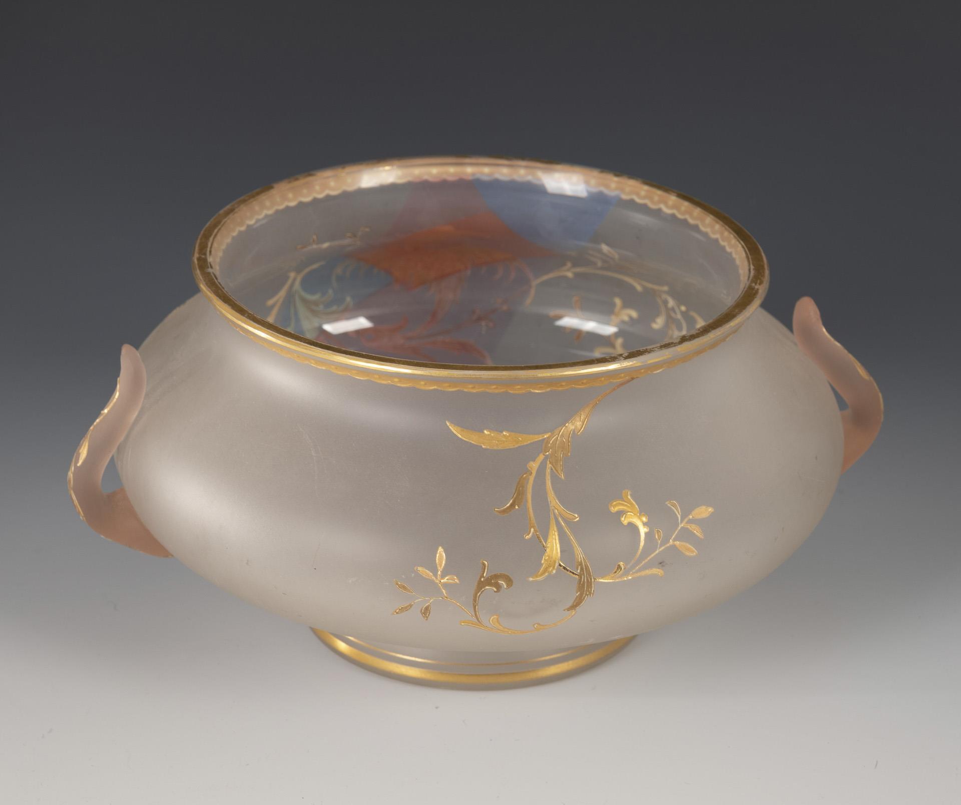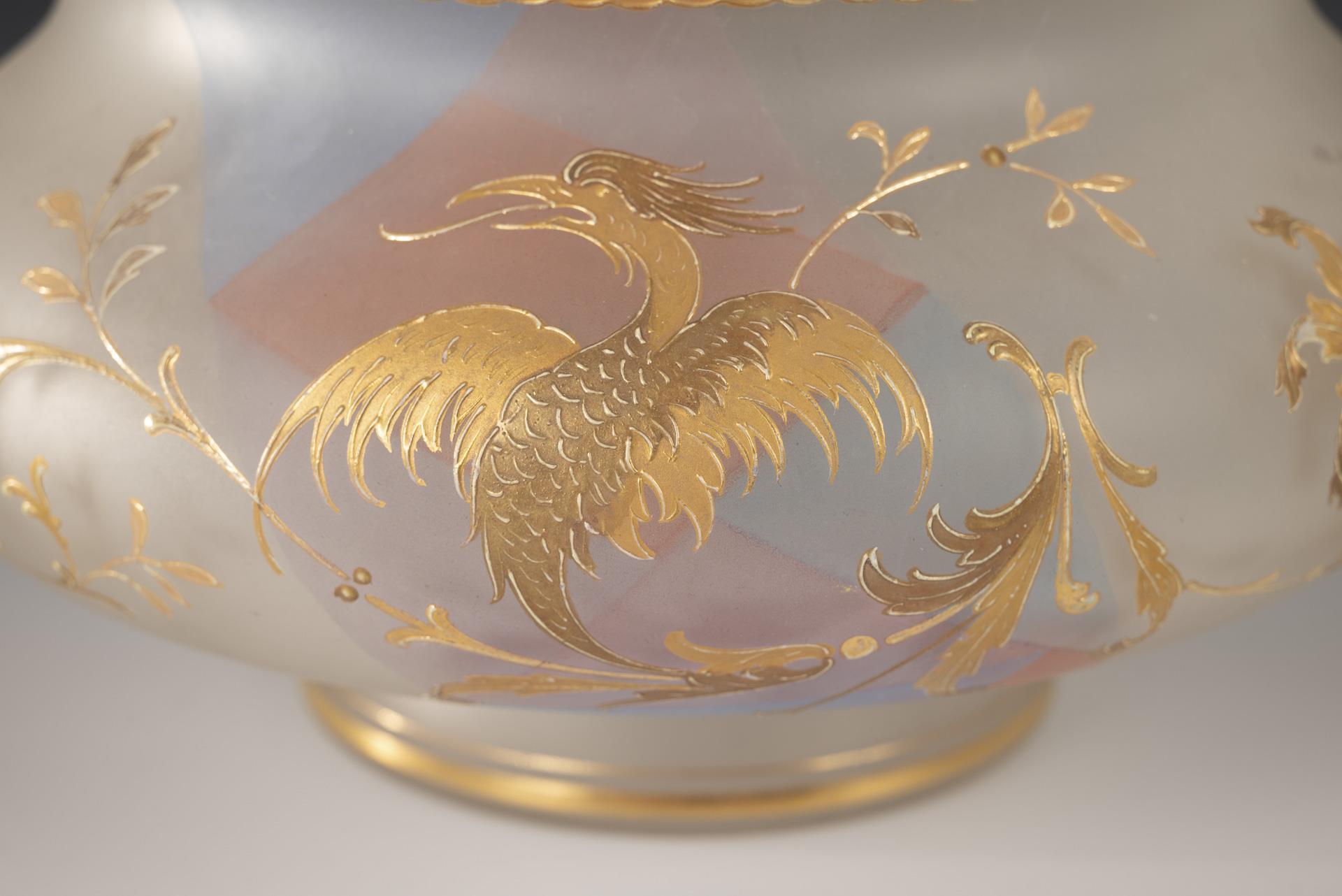 Colourless, frosted glass, coloured glaze, enamel in relief, gold decoration. H 10 cm.