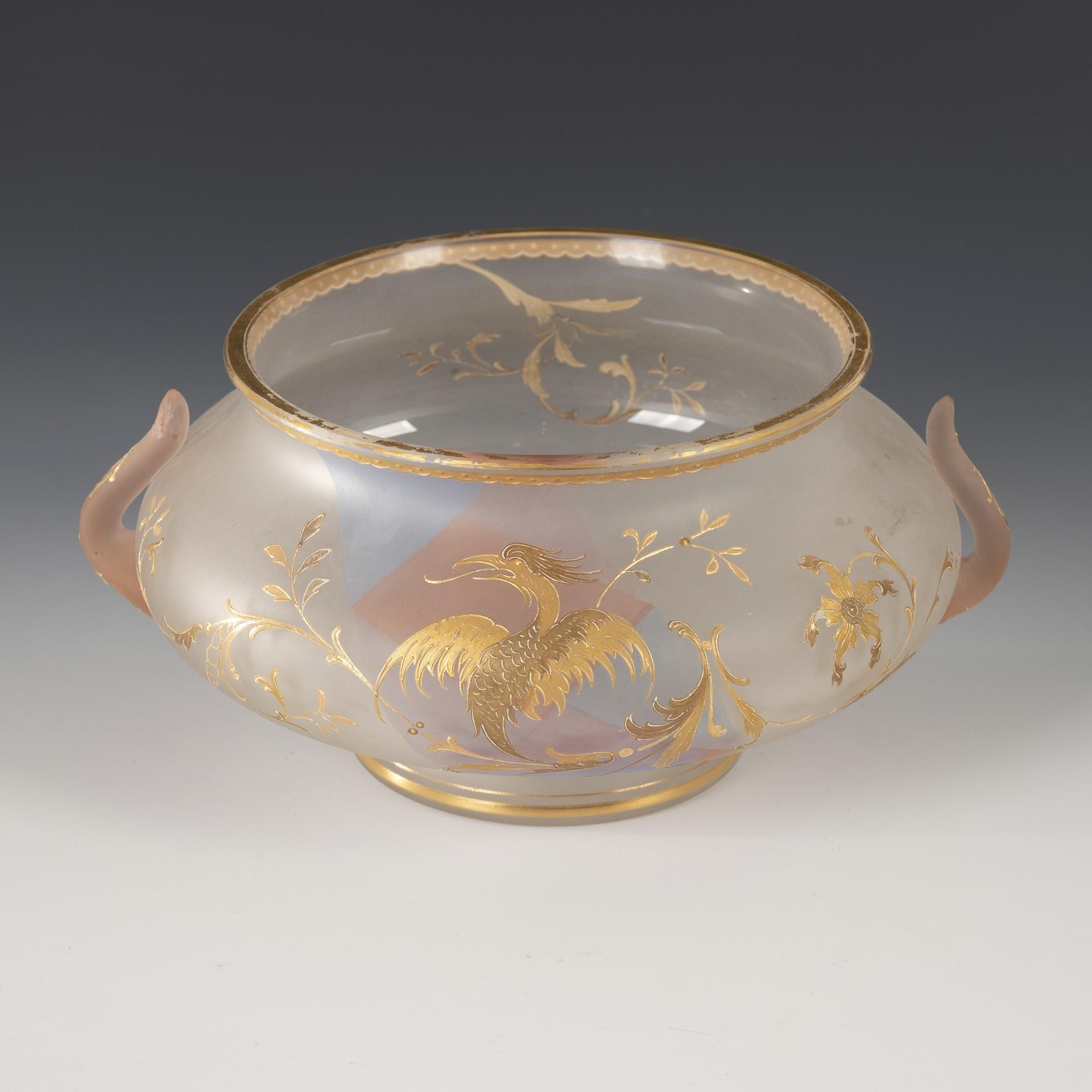 Bowl with a depressed shape over a stepped stand, slightly flared rim, two small handles. The front with a color-blased band in blue, red and purple and a fine painting of a phoenix over floral tendrils in relief enamel and burnished gold. Partial gold abrasion, 1 handle tip polished.