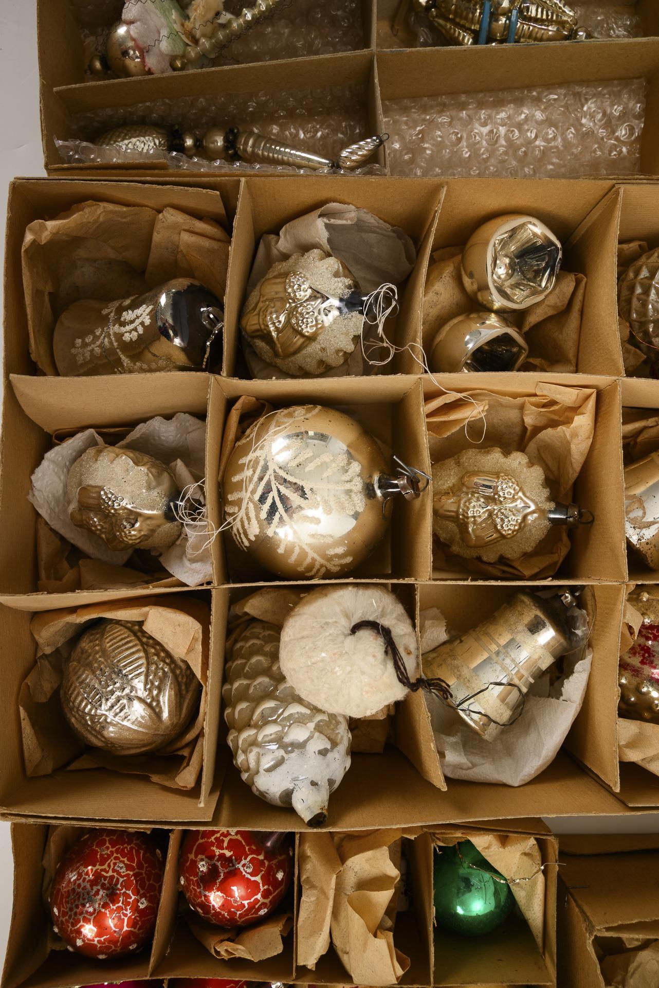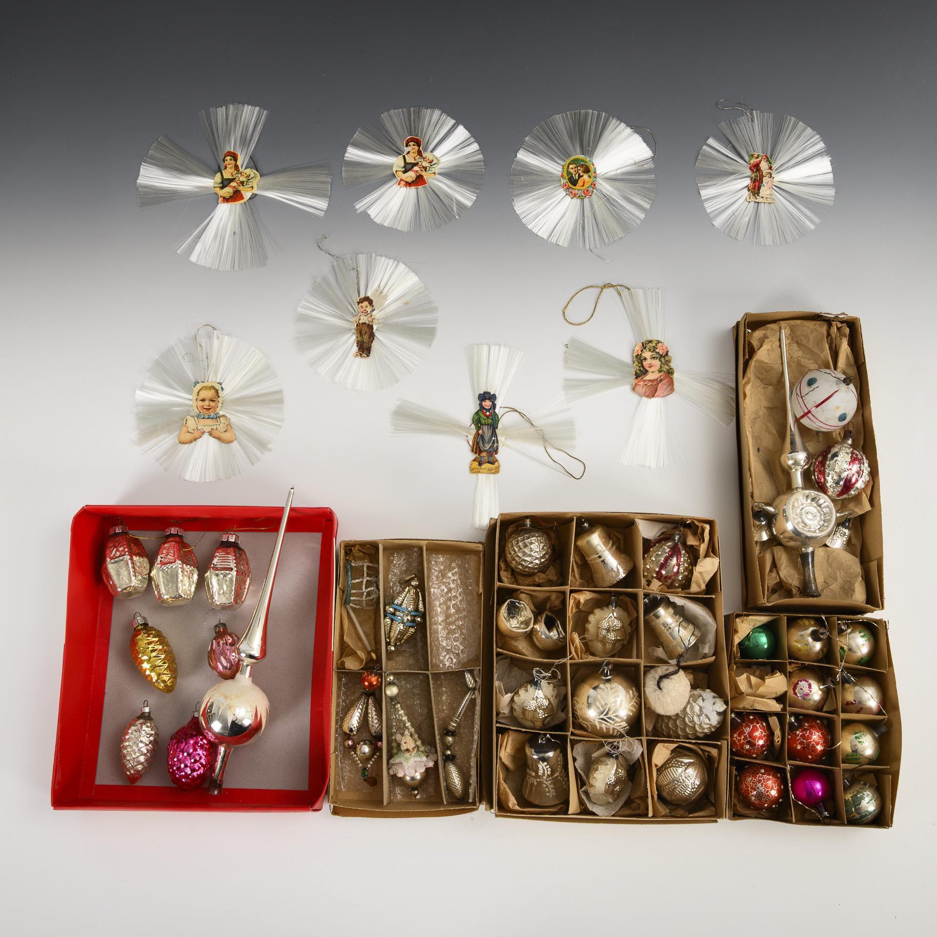 Approx. 34 glass Christmas tree baubles, in the shape of balls, cones, bells etc. Plus two tree toppers (L 27/29 cm), 5 Gablonzer-style pendants and 8 fiberglass tree ornaments with paper decorations.