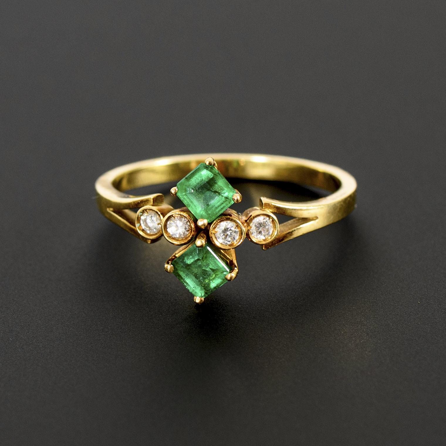 Ring with brilliant-cut diamonds and green colored stones, probably emeralds.