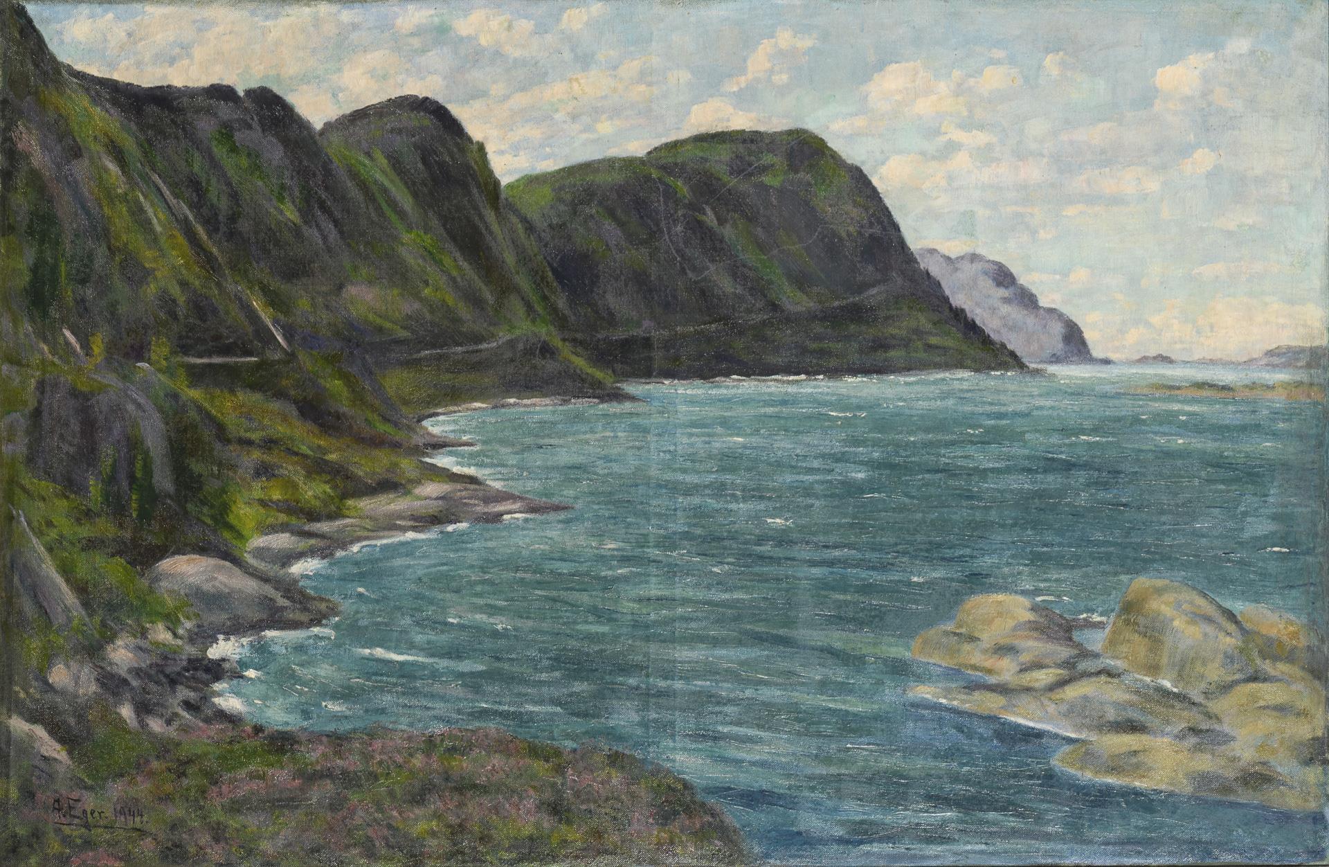 View of the fjord on a bright day under a cloudy sky. Restored, with backing.