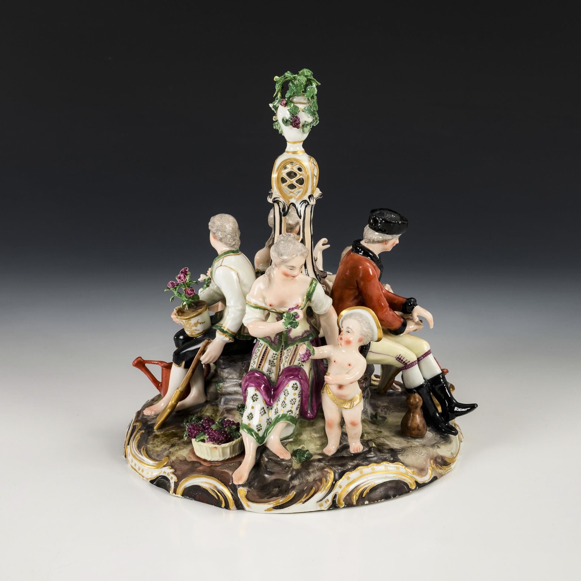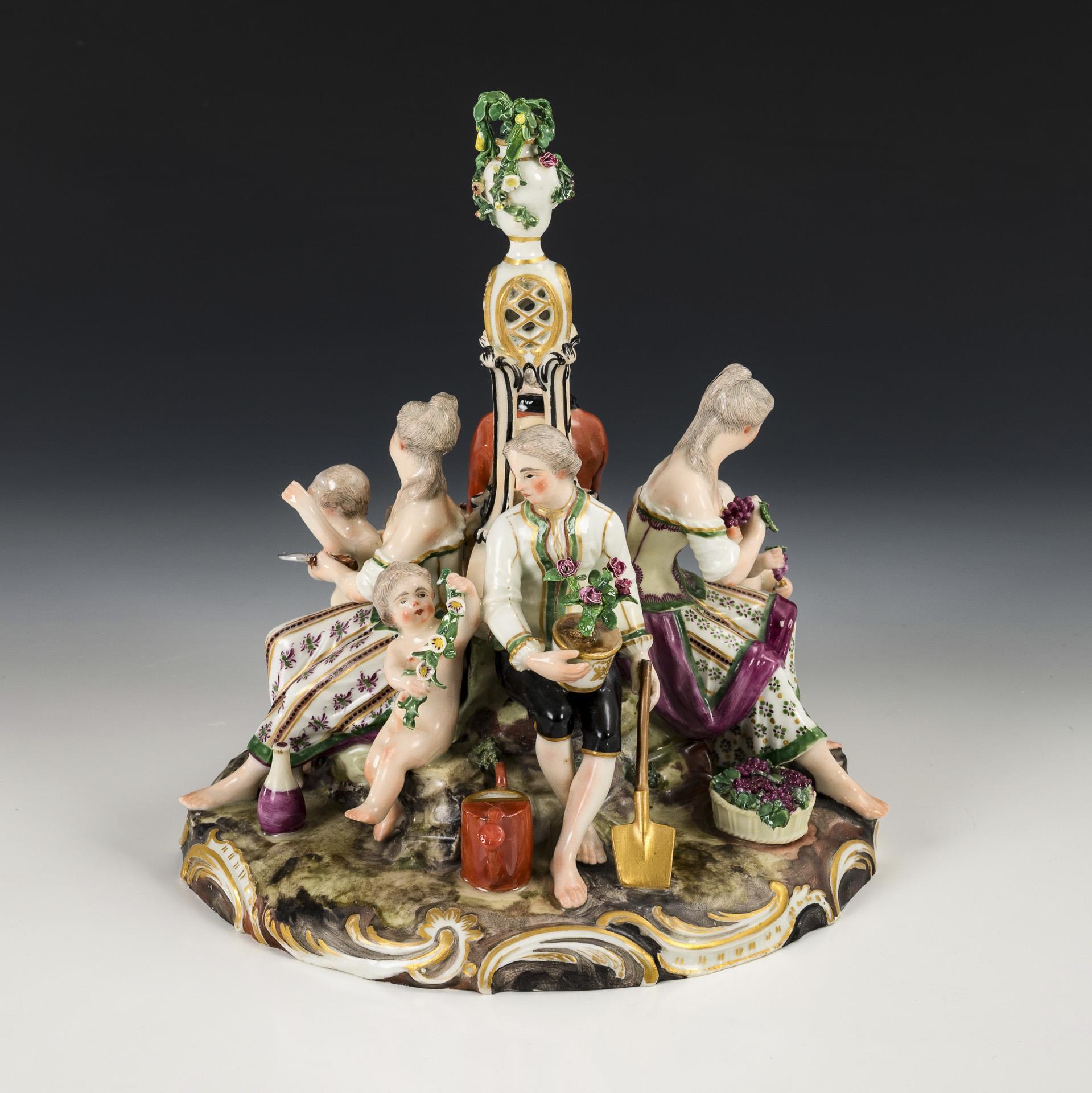 Four personifications of the four seasons seated around an obelisk, each accompanied by a putto. Minimal chip to the edge of the base (Ø approx. 1 mm), 2 putti arms, 2 putti hands, 1 putti foot, sickle, watering can, shoes, left arm and neck of "Winter", partially restored obelisk and flowers and leaves.