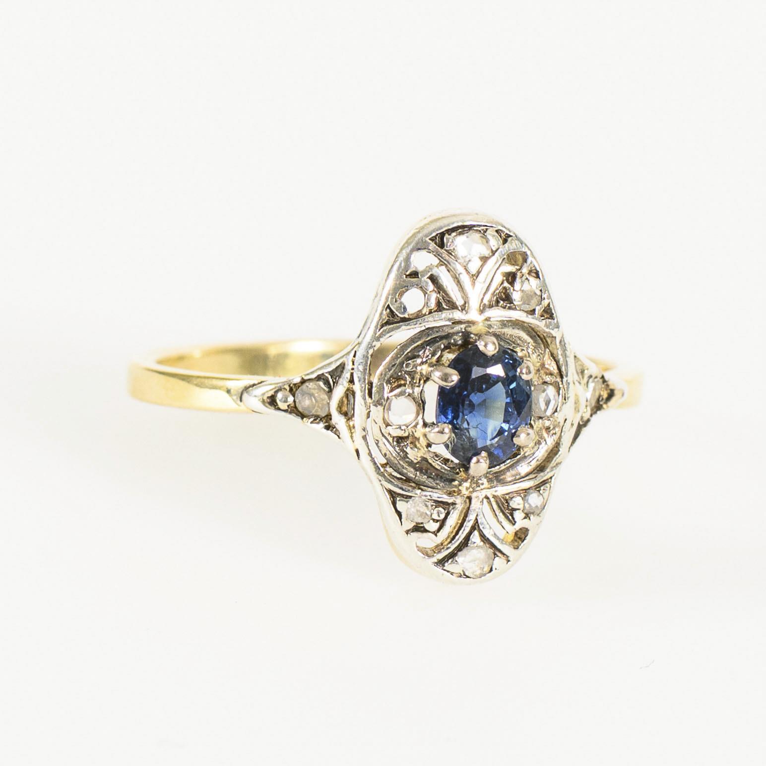 Classical, bicolor ring from the Art Nouveau period with an oval ring head set in white gold, this open-worked and centrally set with a blue coloured stone, possibly sapphire, or a blue synthesis as well as small embedded diamond chips. One diamond chip missing.