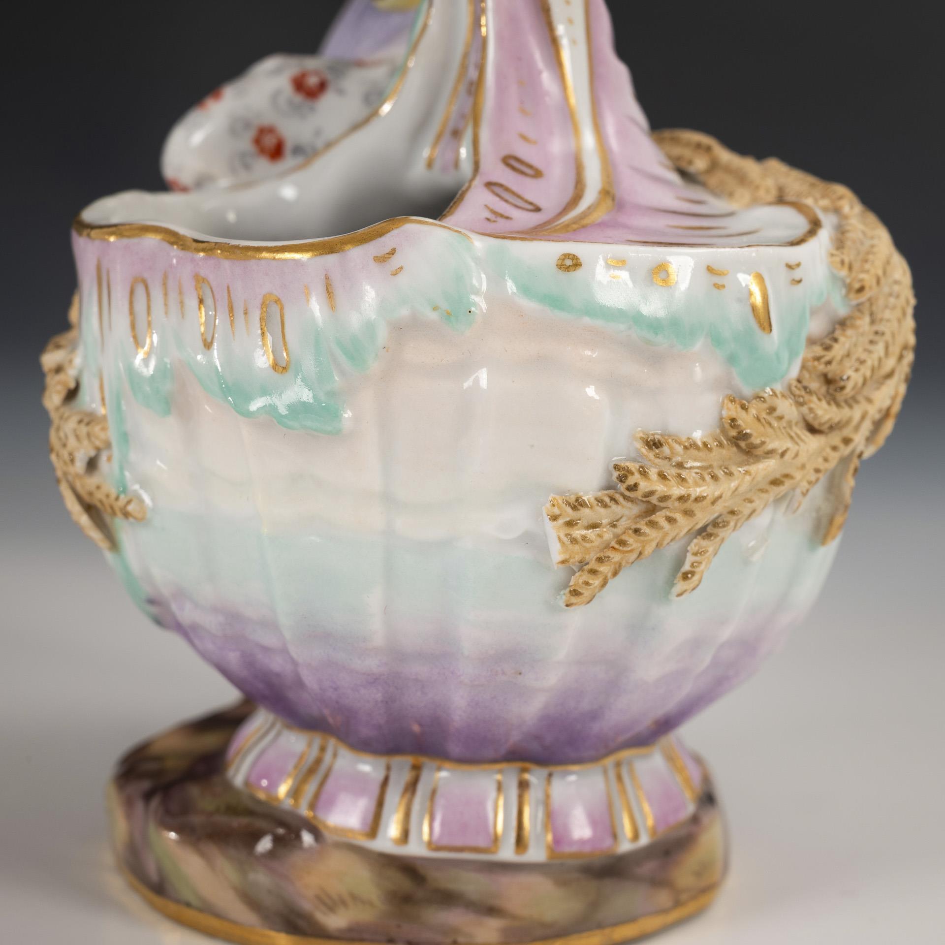 1x model no. 2032, "The Summer" and model no. 2055, "The Winter": young woman and young man respectively at a shell vessel with ears of corn and ivy leaves. Left hand and right sleeve of the woman restored, ears of corn partially chipped, both hands of the boy restored.