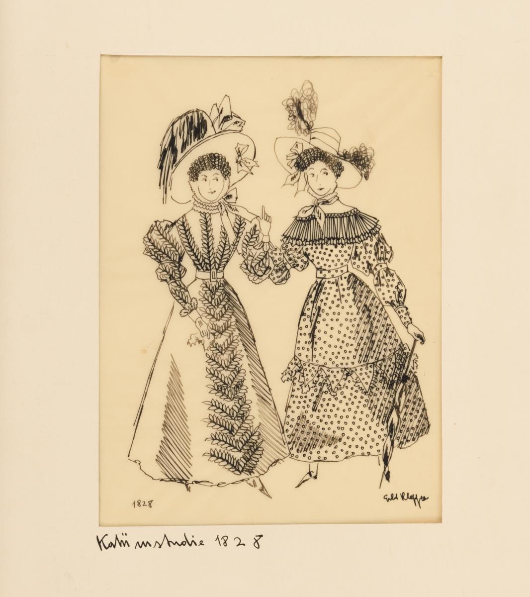 Kostümen. Jeweils 2 Frauen in modischer, zeittypischer Kleidung,