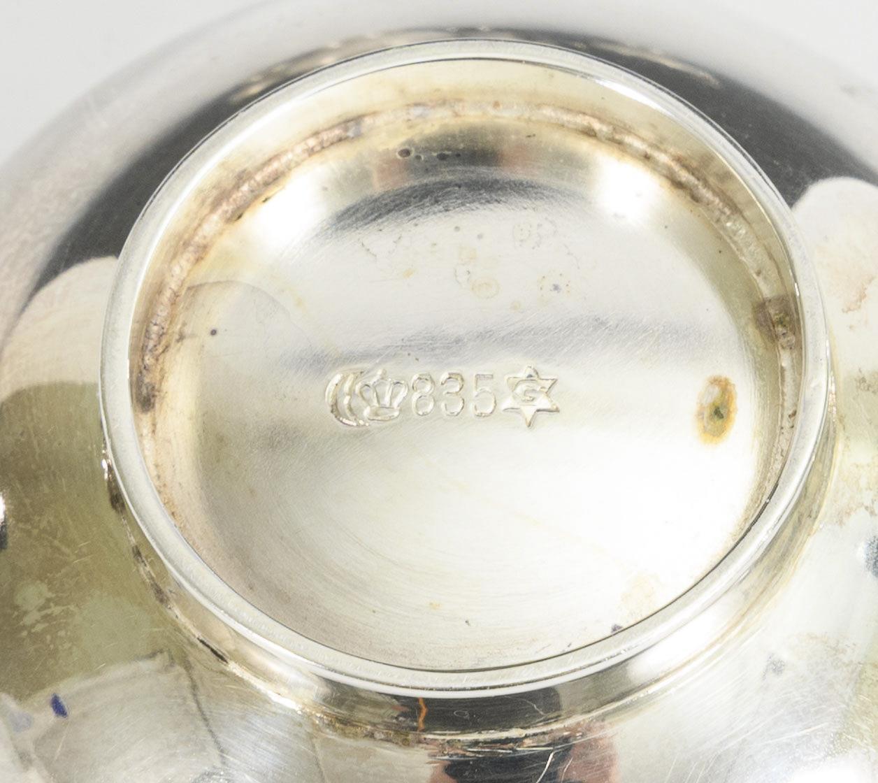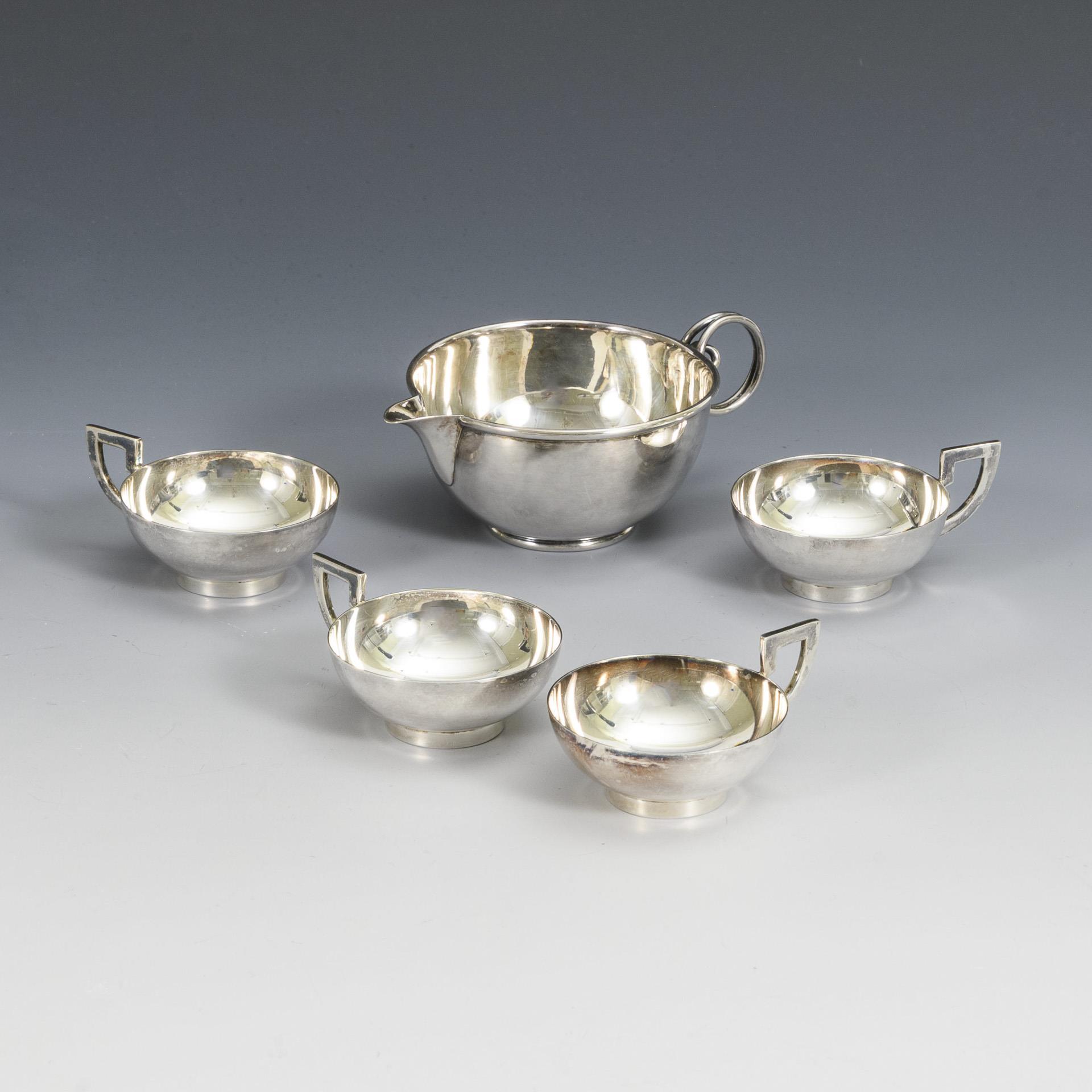 Timeless design in a smooth shape. Cream jug with rolled handle, embossed Bremer Schlüssel/925/crescent/crown logo (H 5 cm). / 4 cups with J-handle, crescent/crown/835/company mark Jakob Grimminger hallmarked (H 3.5 cm).