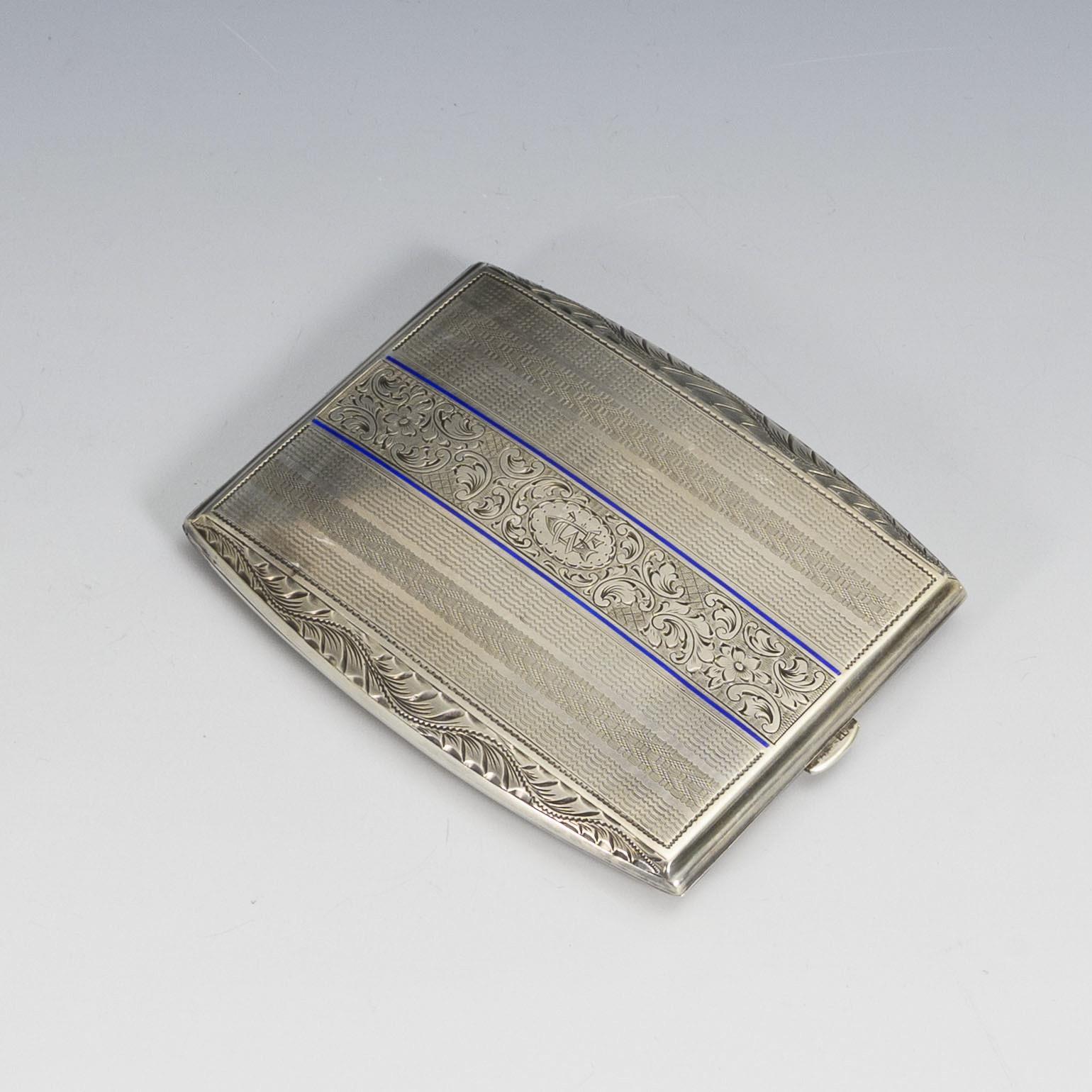 Finely guilloched case with 2 blue enamel inlays and monogram engraving "GW". Gilt interior with date: "Weihnachten 1928". Dents on the underside.
