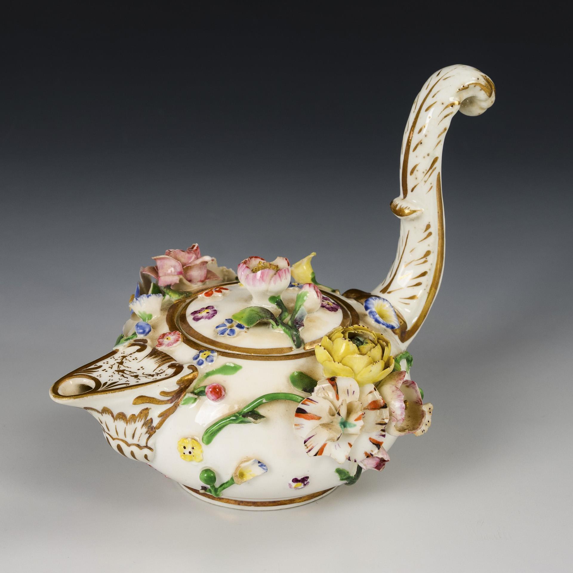 Pressed, bulging jug with high curved handle, floral finial lid and rich floral decoration. Chips to the decoration.