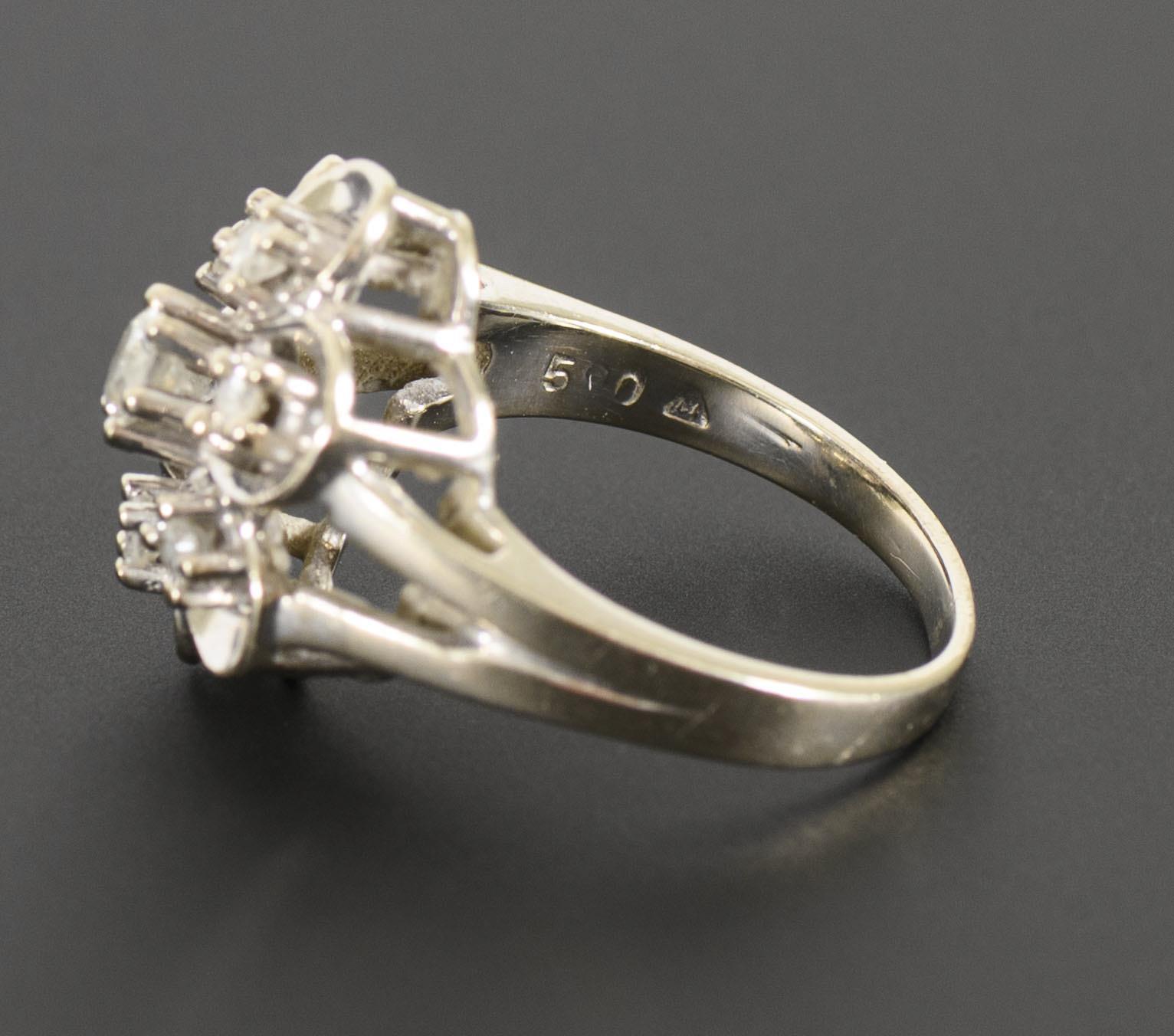 Ring in the shape of a large blossom with one larger and six smaller brilliant-cut diamonds. With slight signs of wear on the underside.