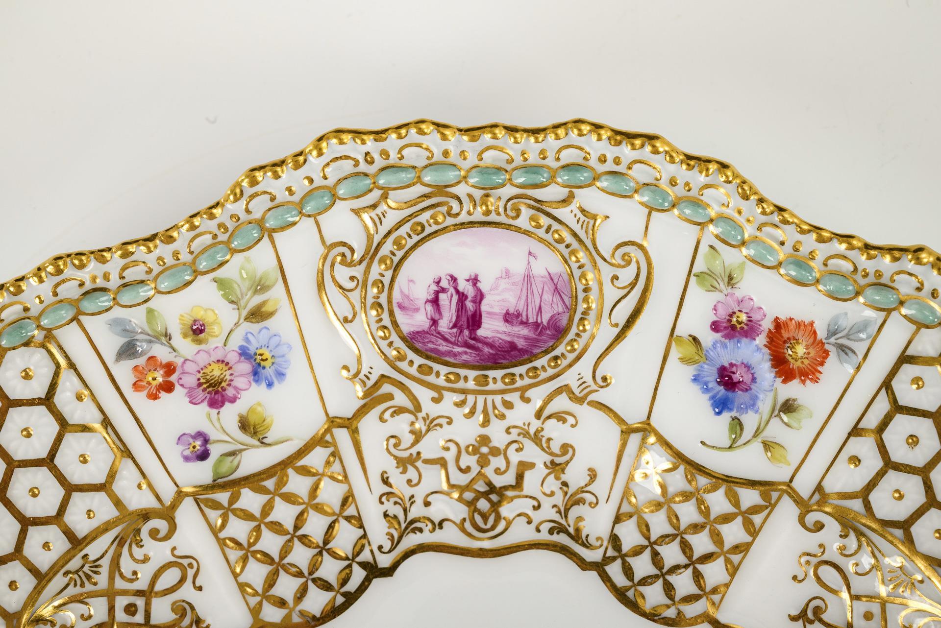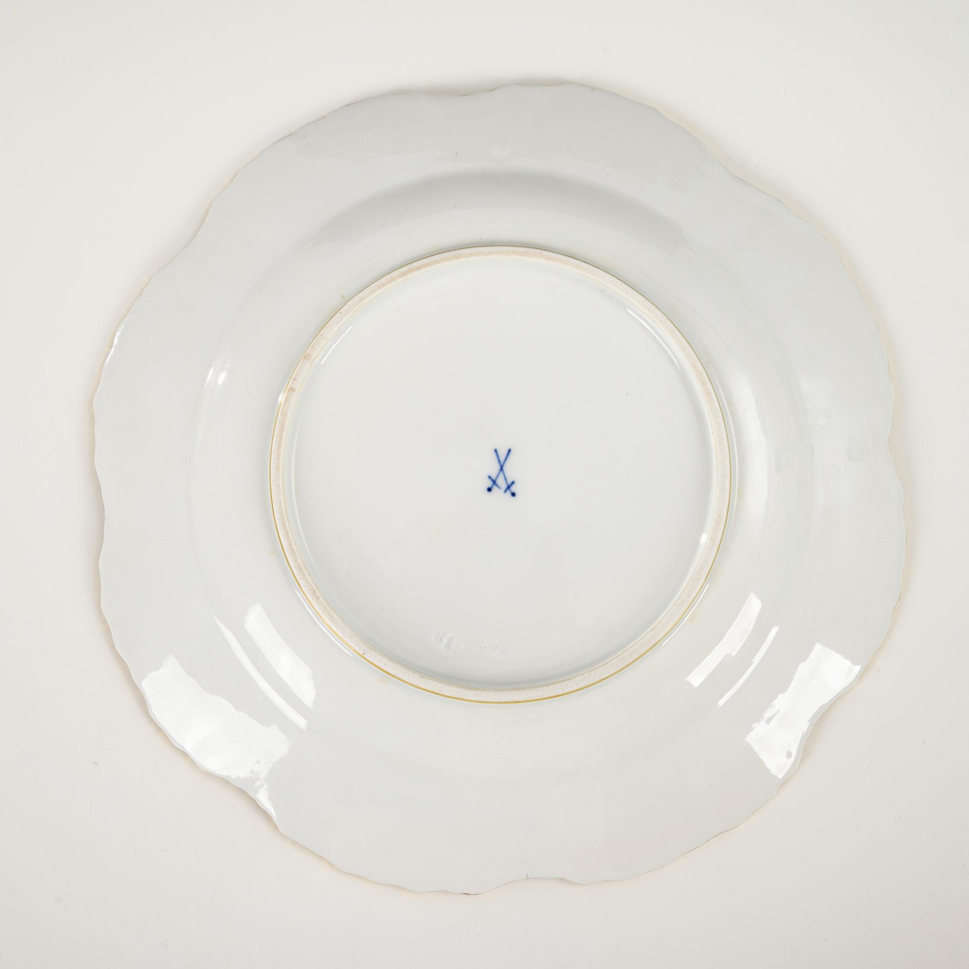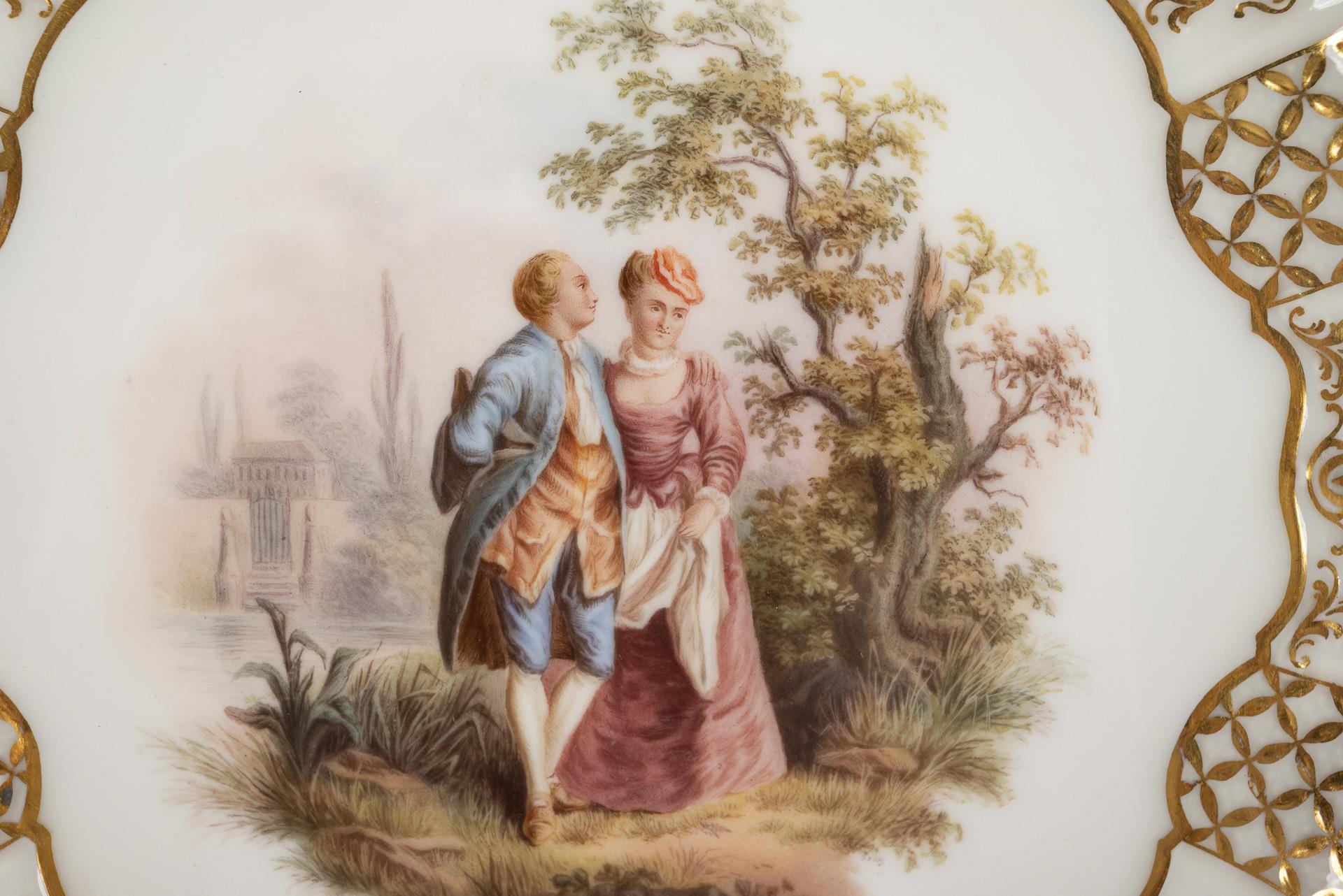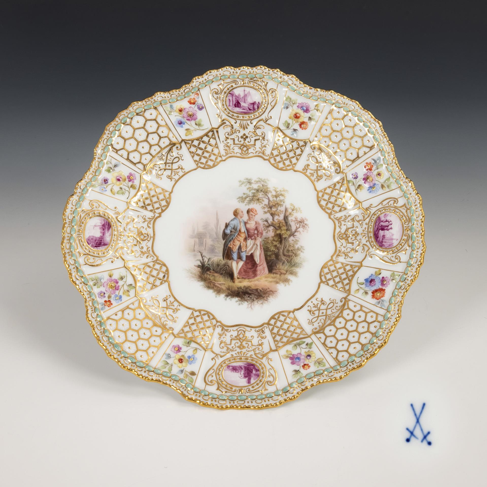 Multi-pass plate with various relief decorations on the rim and fluting. In the mirror the depiction of a young couple in a park landscape, on the rim four medallions with small, purple-painted landscapes.