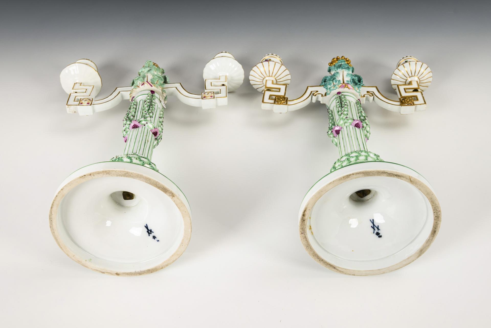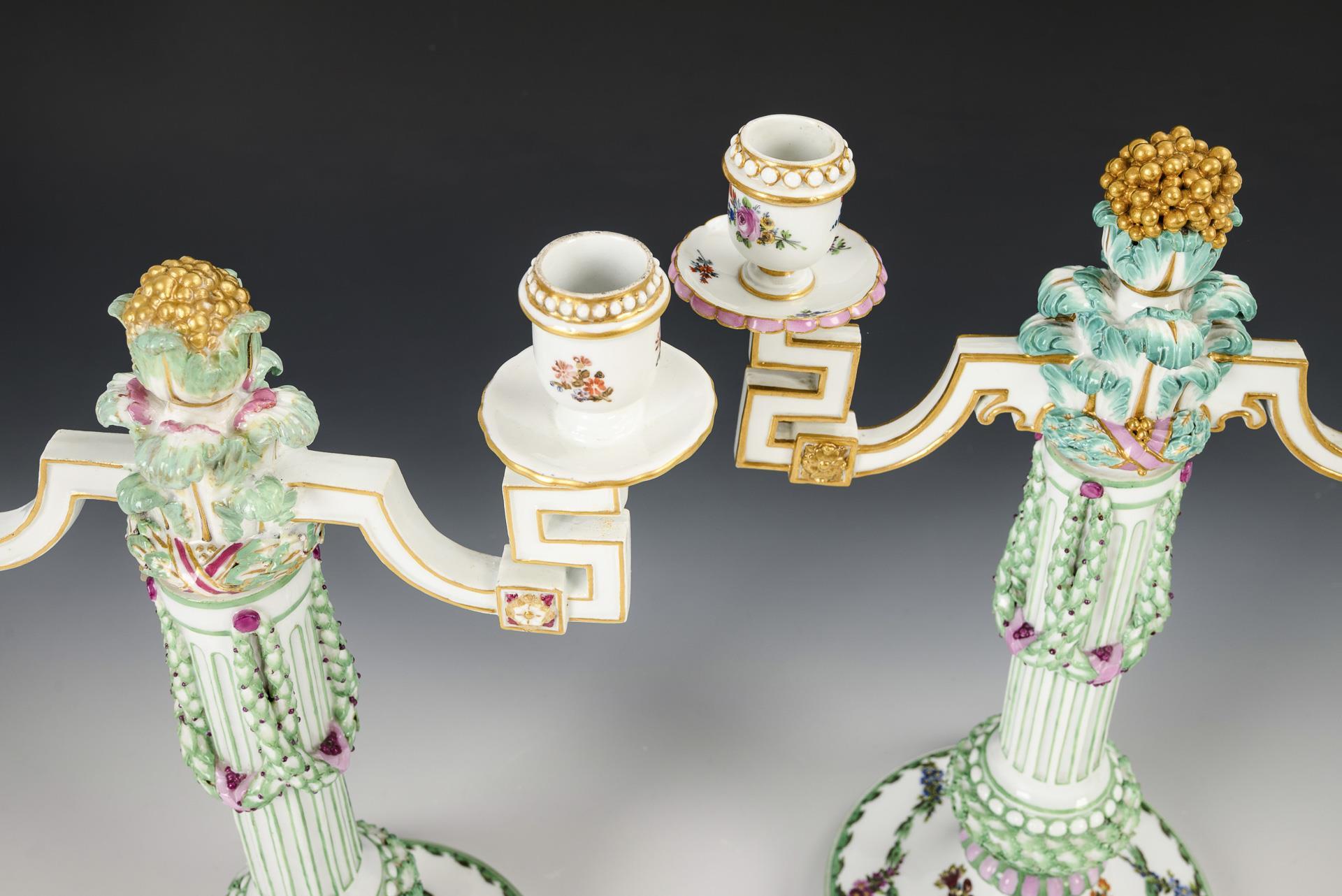Two-armed candlestick with angled, inset candlestick arms, a fluted column with laurel garlands as a shaft, a laurel wreath at the base of the shaft and a round base. The candlestick arms minimally different in the staffage. Minimal chip to 1 candlestick arm, 1 foot with restoration to the rim, 1 laurel wreath chipped, 1 candlestick arm insert with restorations.