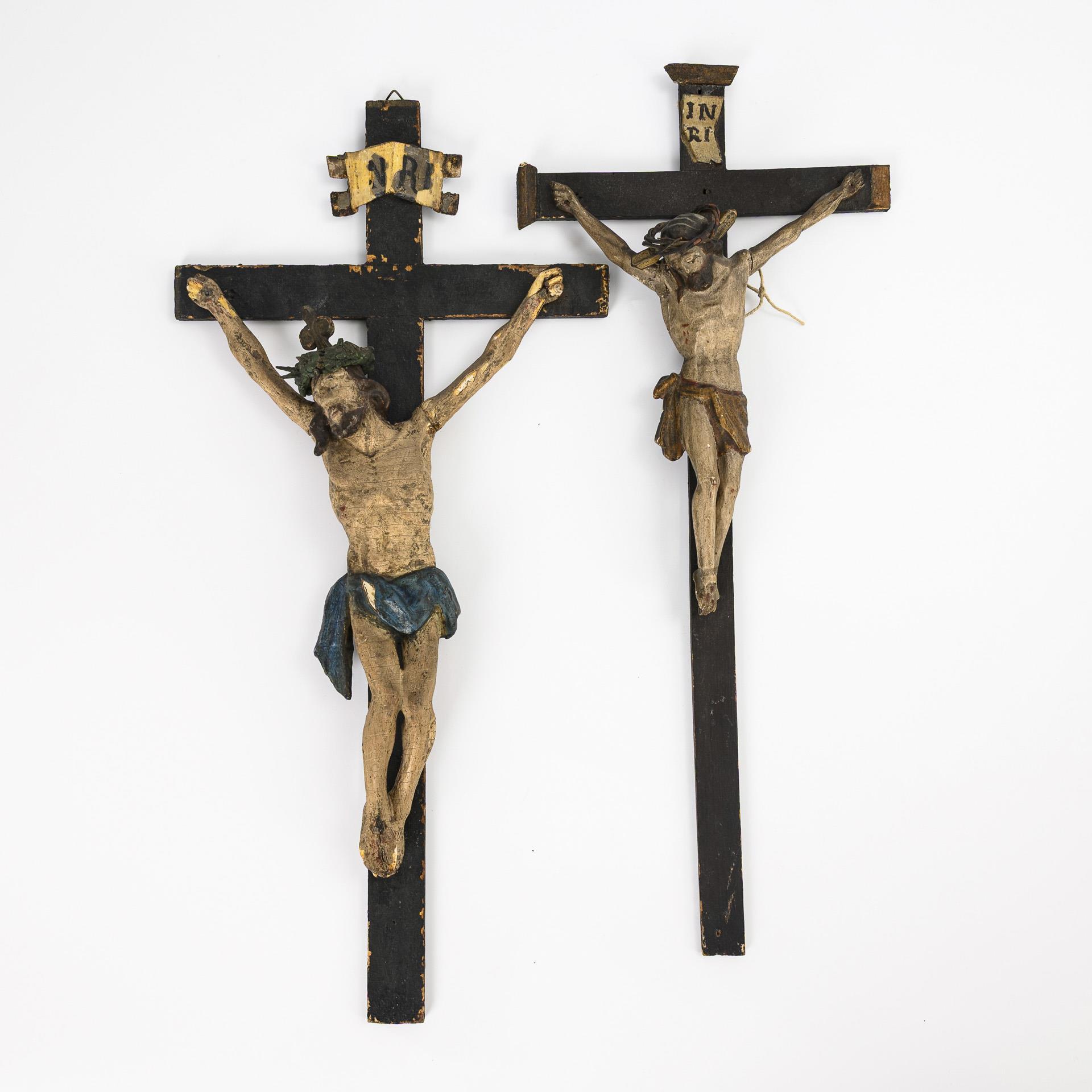 In each case, the dead Christ in the three-nail type on the cross. Some missing parts, old glued arms, severe damage to the polychrome.