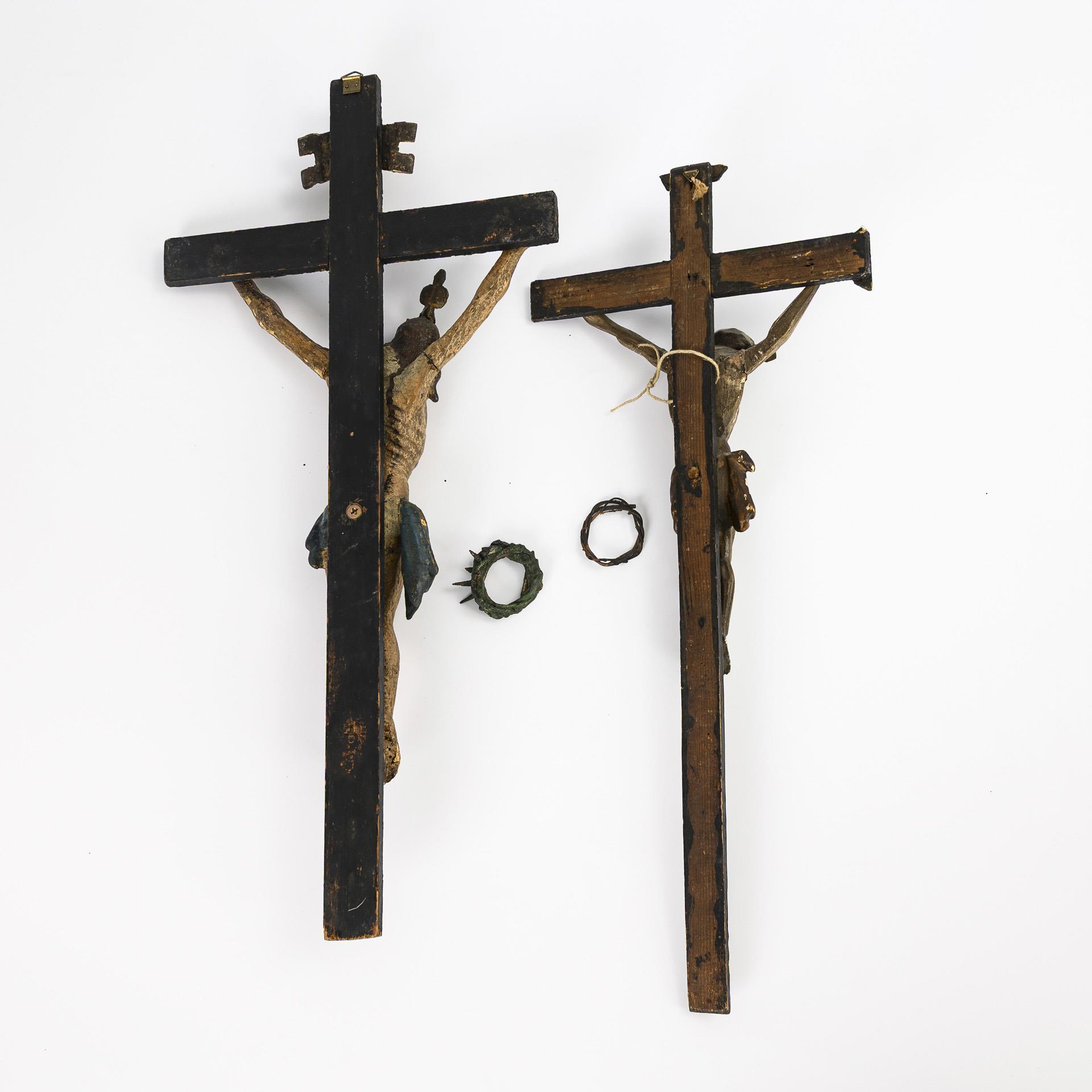 In each case, the dead Christ in the three-nail type on the cross. Some missing parts, old glued arms, severe damage to the polychrome.