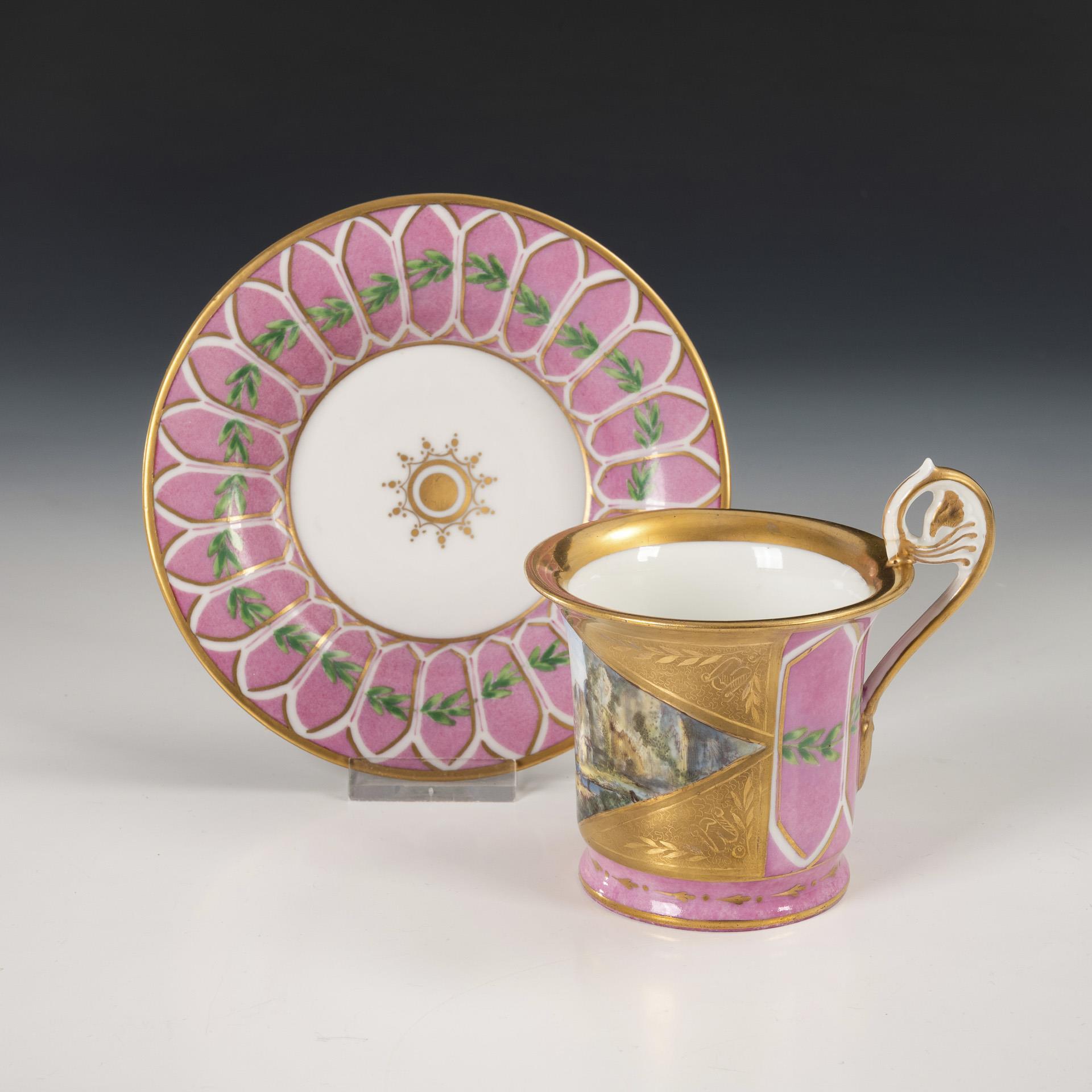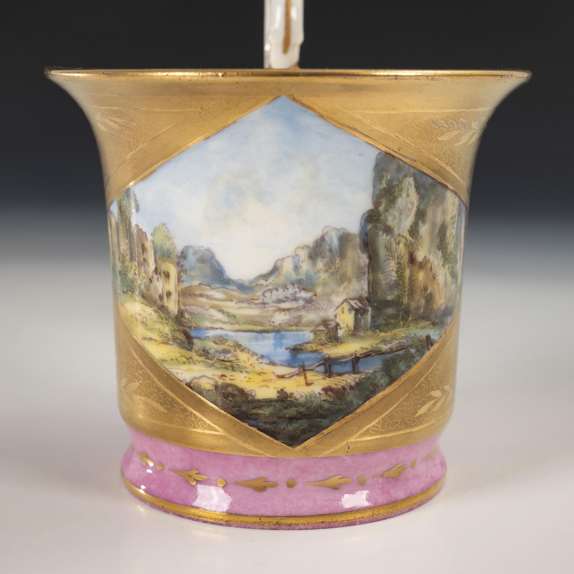 Cylinder cup with slightly fluted foot, crater rim and griffin's head handle. Pink background with pointed arch wreath, on the front a diamond-shaped cartouche depicting an alpine landscape with mountain lake, ruin and small house.