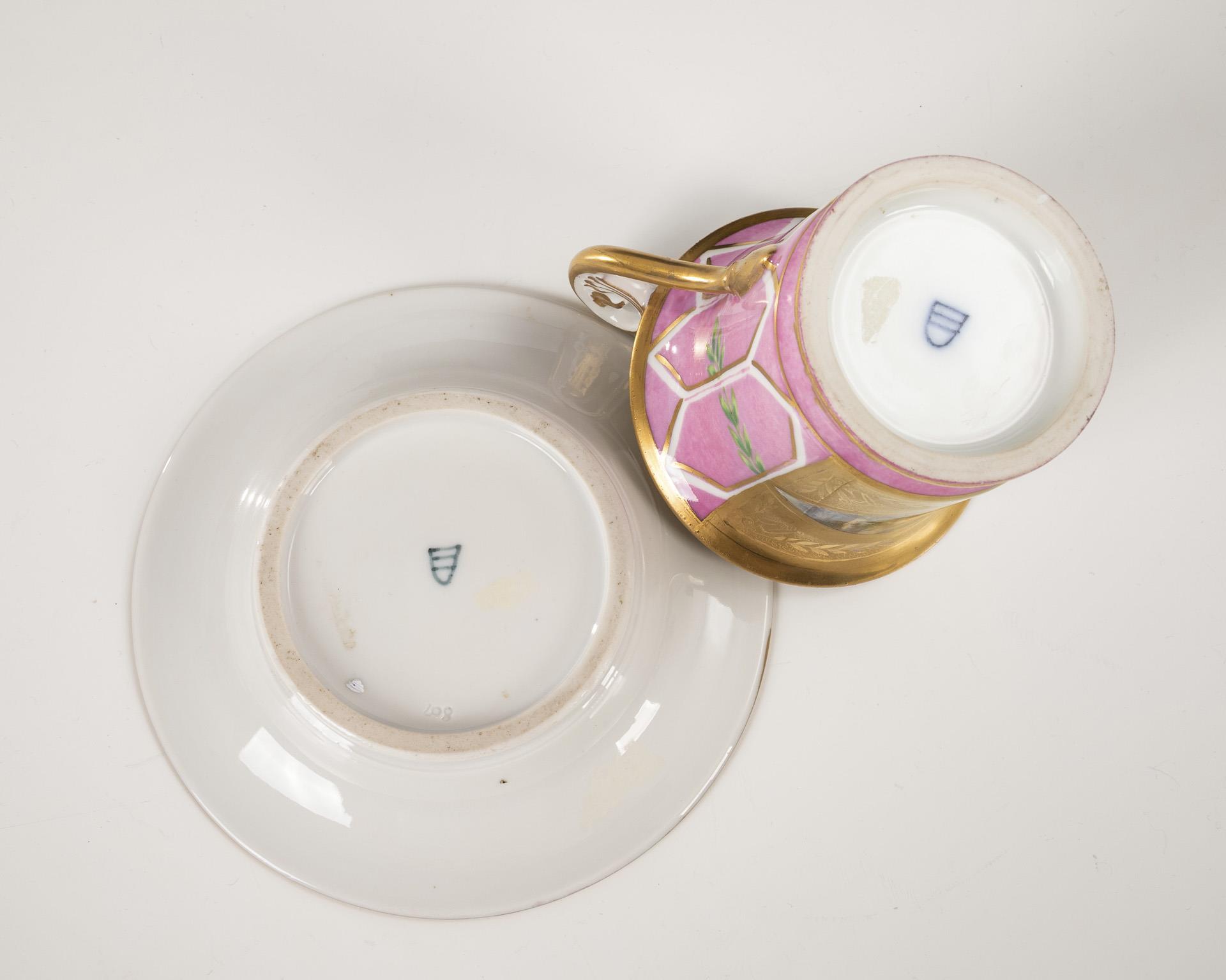 Polychrome painted, decorated in gold. Cup (h 10 cm), original saucer (Ø 14.5 cm).
