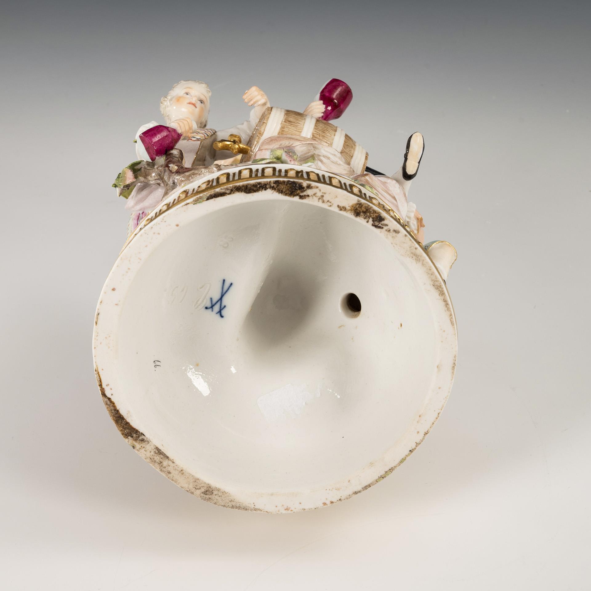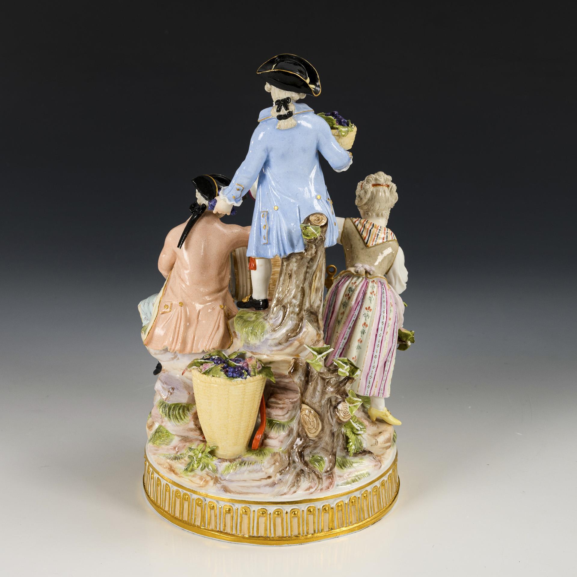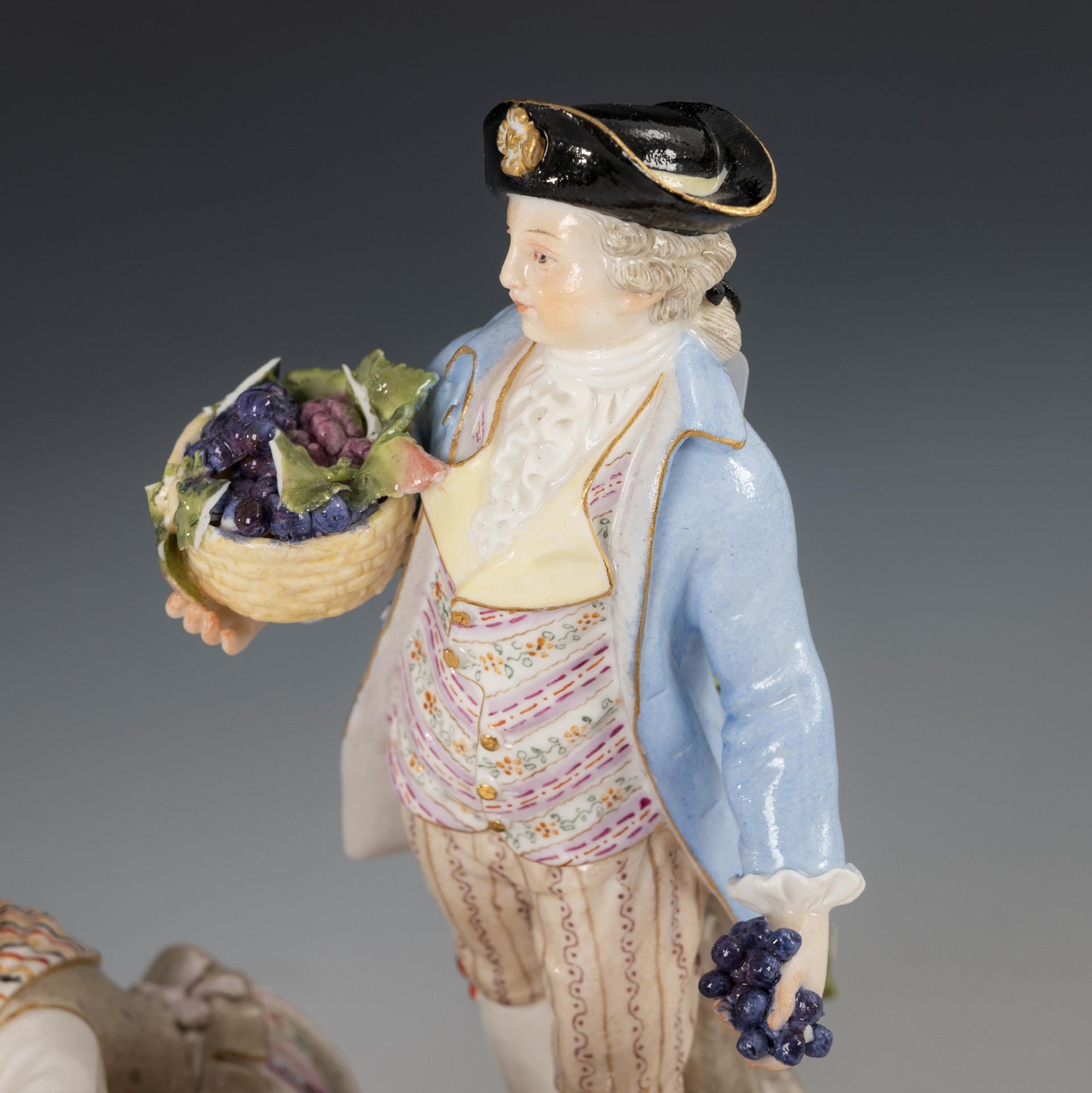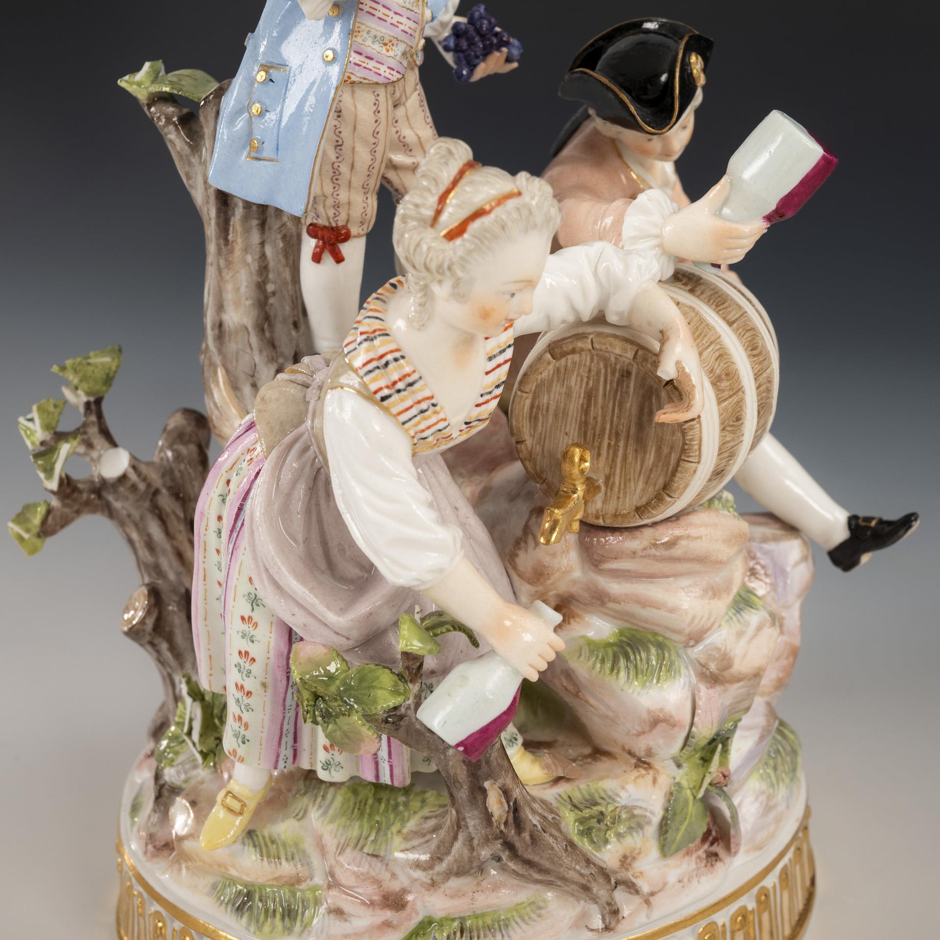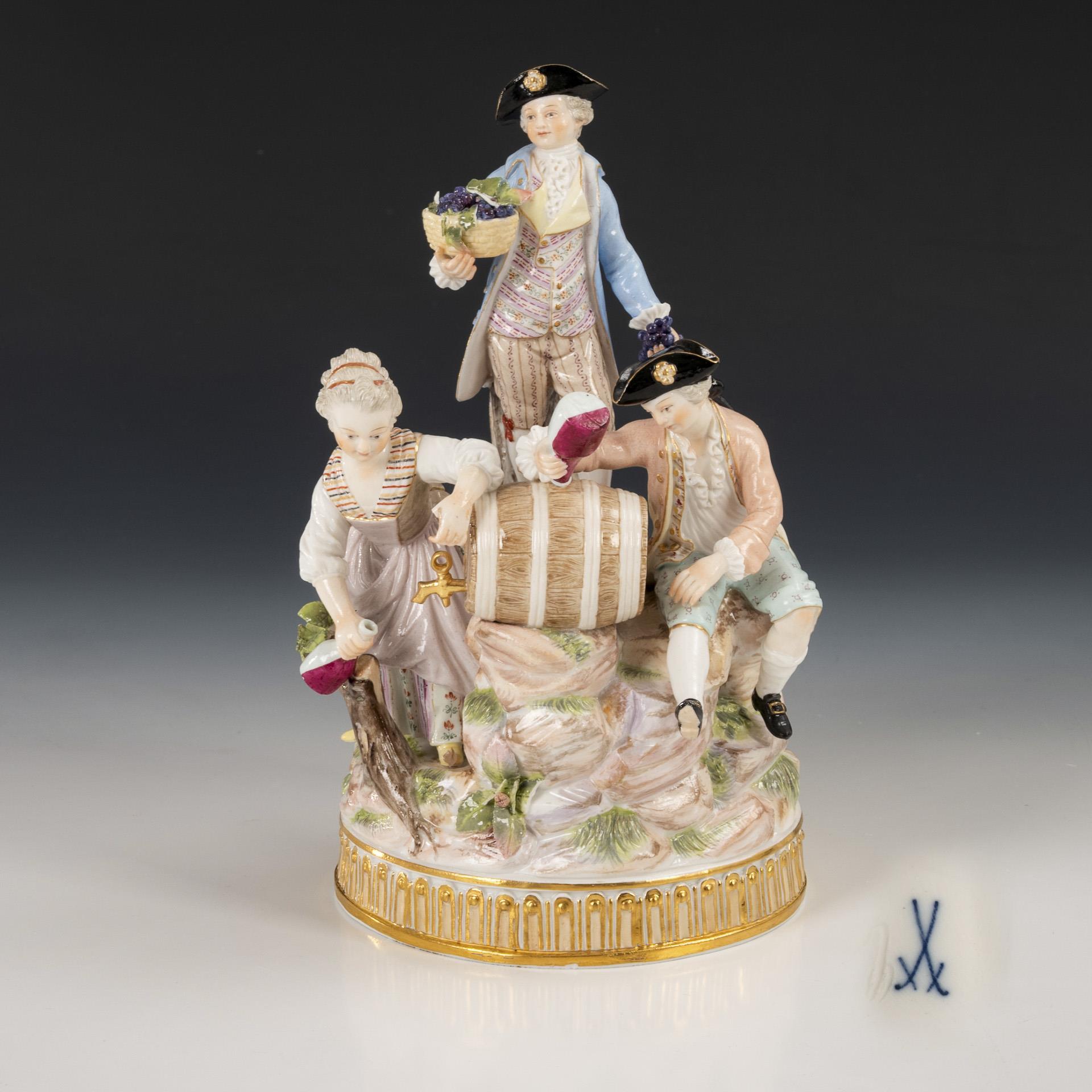 Three figures of a winegrower with a basket of grapes and a winegrower and a winegrower's wife grouped on a rock base, piercing a wine barrel. Leaves, 1 plait and 1 finger chipped.