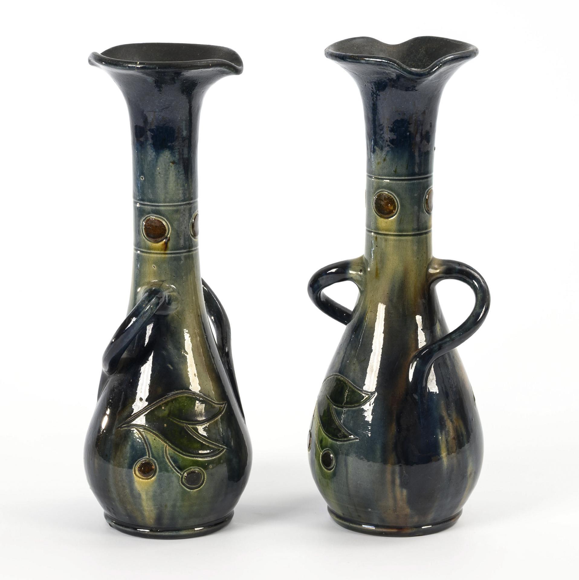 Each drop-shaped with flared rim and two s-shaped handles, circumferential floral stylized incised and stamped decoration.