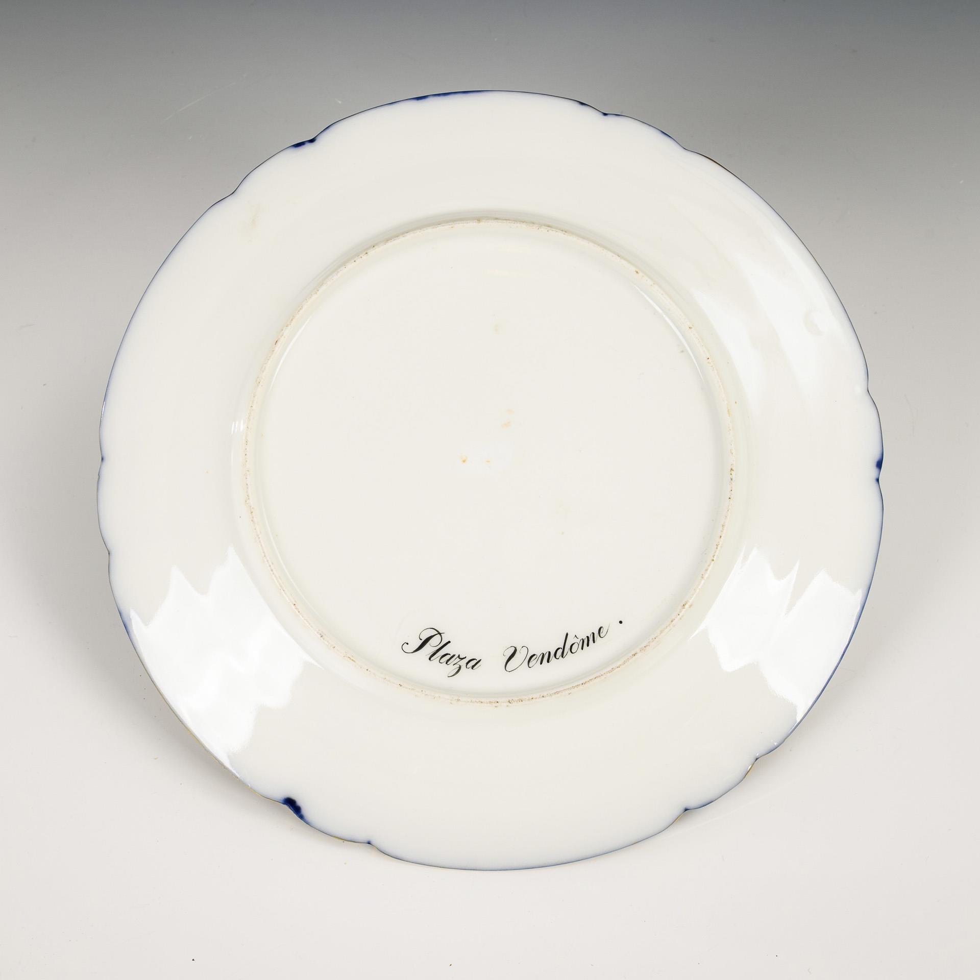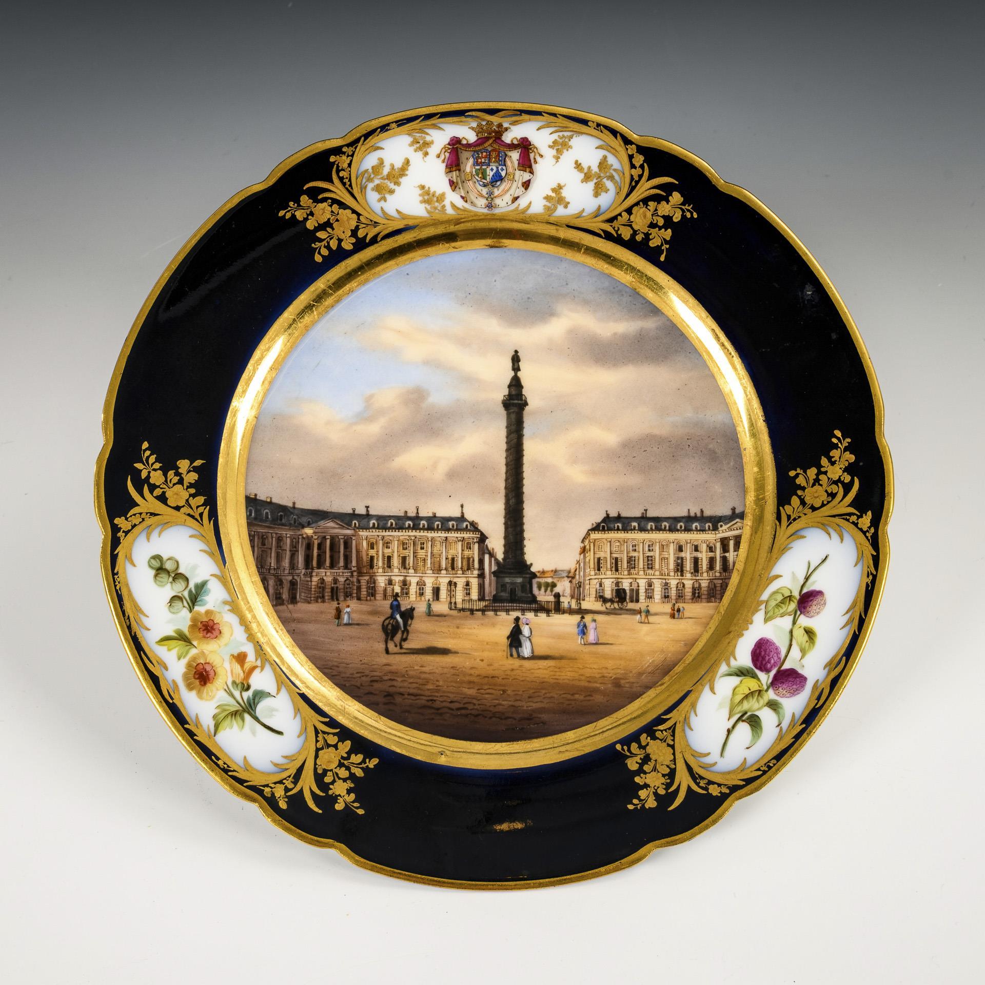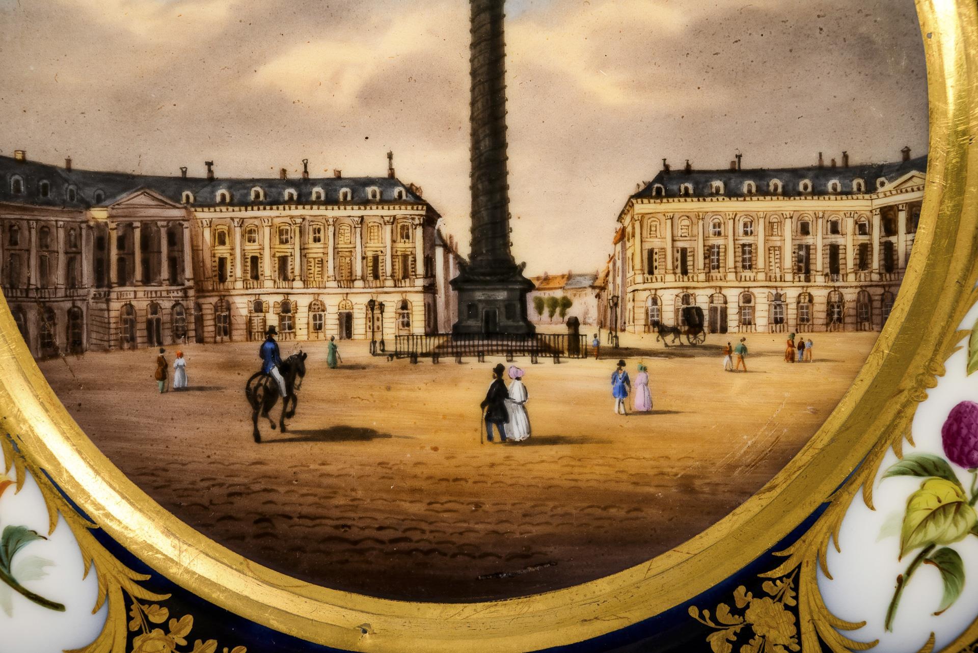 Shape "New cut-out". In the mirror the view of the Place Vendôme in Paris with a view of the Victory Column, cobalt flag with three rocaille shields, 2x flower and fruit painting and 1x royal coat of arms.