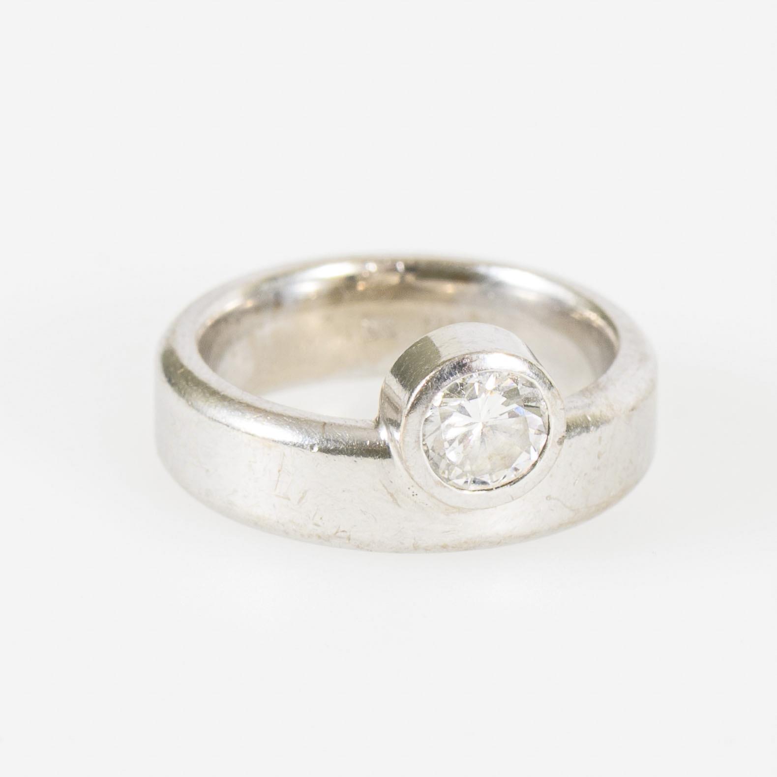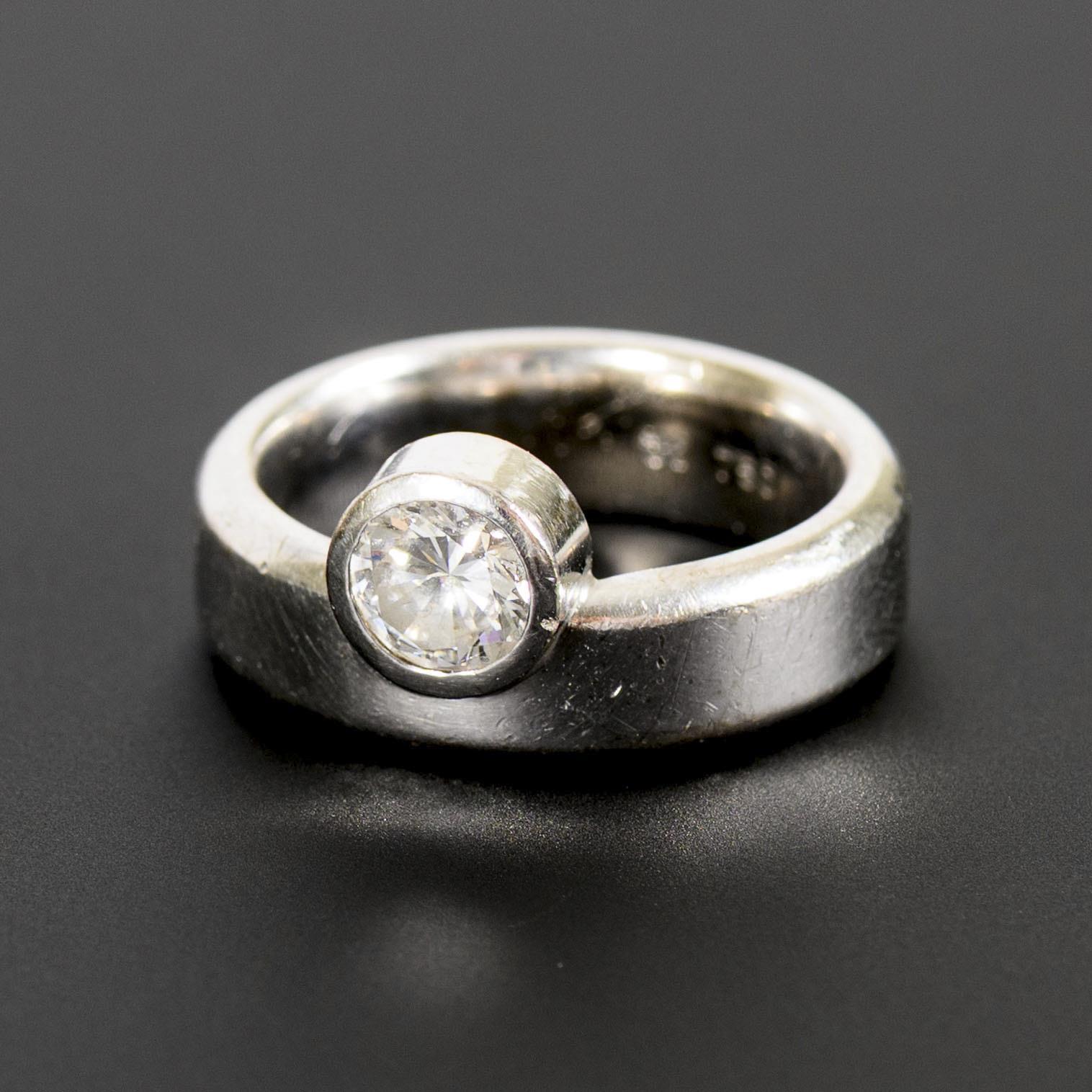 Large, high-quality ring with bezel-set brilliant-cut diamond solitaire. Traces of wear to the ring band and the setting of the brilliant-cut diamond.